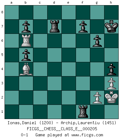 Last move : 0-1 2018 April 7 21:31:8 [Event "FICGS__CHESS__CLASS_E__000205"] [Site "FICGS"] [Date "2018.02.28"] [Round "1"] [White "Ionas,Daniel"] [Black "Archip,Laurentiu"] [Result "0-1"] [WhiteElo "1200"] [BlackElo "1451"] 1.e4 c5 2.Nf3 Nc6 3.Nc3 d6 4.Bb5 Bd7 5.O-O Nf6 6.d4 cxd4 7.Nxd4 Nxd4 8.Bxd7+ Qxd7 9.Qxd4 e5 10.Qe3 Be7 11.h3 O-O 12.Nd5 Bd8 13.Qd3 Qa4 14.Nxf6+ Bxf6 15.b3 Qc6 16.Ba3 Rfd8 17.c4 Rd7 18.Rac1 Rad8 19.Qe3 a6 20.Bb2 h6 21.a4 Bg5 22.f4 Bxf4 23.Rxf4 exf4 24.Qxf4 Qb6+ 25.Kh1 Qxb3 26.Bd4 Qxa4 27.Qg4 g6 28.Qf4 Kh7 29.Qf6 Rg8 30.Rf1 Qxc4 31.Bb2 Qe6 32.Qf3 d5 33.exd5 Qxd5 34.Qf2 h5 35.Qe2 Qb5 36.Qxb5 axb5 37.Rf6 Rc8 38.Rb6 Rc5 39.Ba3 Rf5 40.Bb4 h4 41.Kh2 Rf1 0-1 Sicilian defense Kingside Castling by player White (move 5) Kingside Castling by player Black (move 11) Player Black won this chess game. Follow this game move after move (download)Modern Chess is too much concerned with things like Pawn structure. Forget it, Checkmate ends the game. (Nigel Short) Ich suche im Schach immer etwas Eigenes. Riskantes Spiel im Stile schachlicher Musketiere ist nicht meine Sache, auch wenn es vielen Freunden scharfer Wendungen gefällt. (Anatoly Karpov) Antes de los Finales, los dioses han colocado el Juego Medio. (Siegbert Tarrasch) Ce qui caractérise les parties de combat, c'est que si le défenseur a constamment de difficiles problèmes à résoudre, l'attaquant doit chercher sans relâche de nouvelles possibilités d'attaque. (Koblentz) There is a very easy way to return from a casino with a small fortune : go there with a large one. (Jack Yelton)