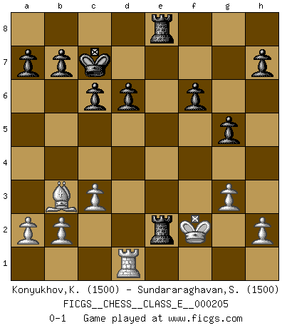 Last move : 0-1 2018 June 30 17:5:29 [Event "FICGS__CHESS__CLASS_E__000205"] [Site "FICGS"] [Date "2018.02.28"] [Round "1"] [White "Konyukhov,Konstantin"] [Black "Sundararaghavan,Shailesh"] [Result "0-1"] [WhiteElo "1500"] [BlackElo "1500"] 1.e4 e5 2.Nf3 Nc6 3.d4 exd4 4.Nxd4 Bc5 5.Nxc6 dxc6 6.Qxd8+ Kxd8 7.Bf4 f6 8.Bc4 Ne7 9.O-O Ng6 10.Bg3 Bd6 11.Bxd6 cxd6 12.Rd1 Kc7 13.Nc3 Ne5 14.Bb3 Re8 15.f4 Ng6 16.g3 Bh3 17.f5 Ne5 18.Ne2 Nf3+ 19.Kf2 Ng5 20.Ng1 Rxe4 21.Nf3 Nxf3 22.Kxf3 Rae8 23.Rd2 Bxf5 24.c3 g5 25.Rad1 Bg4+ 26.Kf2 Bxd1 27.Rxd1 Re2+ 0-1 Scotch game Kingside Castling by player White (move 9) Player Black won this chess game. Follow this game move after move (download)Chess problems demand from the composer the same virtues that characterize all worthwhile art: originality, invention, conciseness, harmony, complexity, and splendid insincerity. (Vladimir Nabokov) Das Schachspiel hat wie die Liebe, die Musik, die Fähigkeit, den Menschen glücklich zu machen. Ich habe ein leises Gefühl des Bedauerns für jeden, der das Schachspiel nicht kennt, so wie ich jeden bedaure, der die Liebe nicht kennt. (Siegbert Tarrasch) ¿Quién es tu oponente esta tarde? Esta tarde mi oponente son las piezas negras. (Akiba Rubinstein) Même un GMI sait rarement calculer sur plus de cinq coups une attaque à sacrifices. (Rudolf Spielmann) Luck has a peculiar habit of favoring those who don't depend on it. (Author unknown)