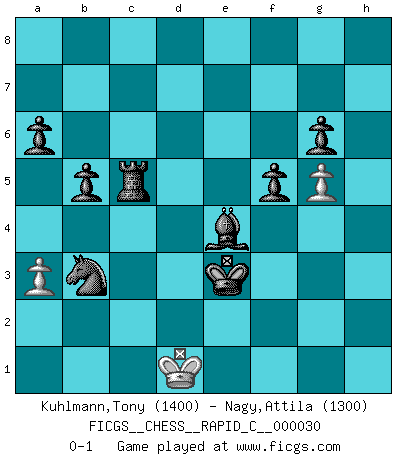 Last move : 0-1 2007 September 15 21:39:24 [Event "FICGS__CHESS__RAPID_C__000030"] [Site "FICGS"] [Date "2007.04.25"] [Round "1"] [White "Kuhlmann,Tony"] [Black "Nagy,Attila"] [Result "0-1"] [WhiteElo "1400"] [BlackElo "1300"] 1.d4 Nf6 2.c4 e6 3.Nf3 b6 4.g3 Ba6 5.Qc2 c5 6.Bg2 Nc6 7.dxc5 Bxc5 8.a3 Rc8 9.b4 Be7 10.Nbd2 b5 11.c5 d6 12.Nb3 dxc5 13.Nxc5 Nd7 14.O-O Nxc5 15.bxc5 Qa5 16.Bb2 O-O 17.Rfd1 Rfd8 18.Rxd8+ Rxd8 19.Qe4 Qc7 20.Rc1 Bb7 21.Qg4 g6 22.e3 e5 23.Ng5 h5 24.Qh4 Qd7 25.f4 Qd2 26.g4 Qxe3+ 27.Qf2 Qxf2+ 28.Kxf2 Rd2+ 29.Kg3 exf4+ 30.Kxf4 Rxg2 31.h3 Bxg5+ 32.Kxg5 Rxb2 33.Rc3 hxg4 34.hxg4 Kg7 35.Kf4 Rd2 36.Rb3 a6 37.Ke3 Rd4 38.Kf3 Na5 39.Ke3 Nxb3 40.g5 Re4+ 41.Kf3 Rc4 42.Ke3 f5 43.Kd3 Rxc5 44.Ke2 Kf7 45.Ke3 Ke6 46.Ke2 Ke5 47.Kf2 Kf4 48.Ke2 Be4 49.Kd1 Ke3 0-1 Queen's Indian : Nimzovich variation (exaggerated Fianchetto) Kingside Castling by player White (move 14) Kingside Castling by player Black (move 16) Player Black won this chess game. Follow this game move after move (download)Help your pieces so they can help you. (Paul Morphy) Im Blitz ist es einfacher mit einer Figur weniger anzugreifen, als sich mit einer Mehrfigur zu verteidigen. (Mikhail Nekhemyevich Tal) El Ajedrez, como cualquier otra actividad creativa, puede existir solo a través de méritos combinados de aquellos que tienen talento creativo y de aquellos que tienen la habilidad de organizar un trabajo creativo. (Mikhail Botvinnik) Le plus grand jeu de l'esprit jamais inventé, plus vous l'apprenez, plus vous y prenez du plaisir. (Garry Kasparov) Life is pleasant. Death is peaceful. It's the transition that's troublesome. (Isaac Asimov)