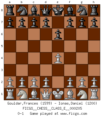 Last move : 0-1 2018 May 2 10:30:26 [Event "FICGS__CHESS__CLASS_E__000205"] [Site "FICGS"] [Date "2018.02.28"] [Round "1"] [White "Gouldar,Frances"] [Black "Ionas,Daniel"] [Result "0-1"] [WhiteElo "1599"] [BlackElo "1200"] 1.e4 e6 0-1 This chess game has been lost on time (started : 2018.02.28 15:38:10) French defense Player Black won this chess game. Follow this game move after move (download)Live, lose, and learn, by observing your opponent how to win. (Amber Steenbock) Schach ist mein Leben, meine Leidenschaft, was ich gelernt habe und seit meinem 14. Lebensjahr profimässig praktiziere. Darauf zu verzichten, würde mir sehr schwer fallen. (Viktor Kortschnoi) Cuando tu no sabes absolutamente que mas hacer, es tiempo de entrar en pánico. (John van der Wiel) On a dit que l'homme se distingue de l'animal par le fait qu'il achète plus de livres qu'il ne peut en lire. Je voudrais suggérer qu'inclure à la liste des livres quelques livres d'échecs rendrait la distinction manifeste. (Edward Lasker) He who laughs last probably does not get the joke. (Unknown)