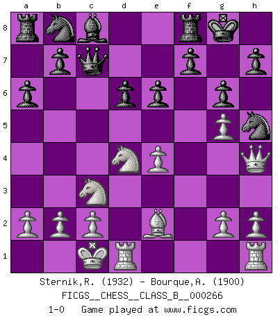 Last move : 1-0 2018 May 27 0:16:48 [Event "FICGS__CHESS__CLASS_B__000266"] [Site "FICGS"] [Date "2018.02.28"] [Round "1"] [White "Sternik,Ryszard"] [Black "Bourque,Alexandre"] [Result "1-0"] [WhiteElo "1932"] [BlackElo "1900"] 1.e4 c5 2.Nf3 d6 3.d4 cxd4 4.Nxd4 Nf6 5.Nc3 a6 6.Bg5 e6 7.f4 Be7 8.Qf3 Qc7 9.O-O-O O-O 10.Qg3 Nh5 11.Qh4 Bxg5 12.fxg5 g6 13.Be2 1-0 This chess game has been lost on time (started : 2018.02.28 19:28:7) Sicilian : Najdorf, 7...Be7 Queenside Castling by player White (move 9) Kingside Castling by player Black (move 9) Player White won this chess game. Follow this game move after move (download)Some part of a mistake is always correct. (Savielly Tartakover) Die Fehler sind da, Sie warten nur darauf gemacht zu werden. (Savielly Grigorievitsch Tartakower) No puedes jugar al Ajedrez si eres de corazón noble. (Proverbio Francés) Les Echecs sont affaire de jugement sensible. Savoir quand frapper et quand esquiver. (Fischer) Somehow our devils are never quite what we expect when we meet them face to face. (Nelson DeMille)