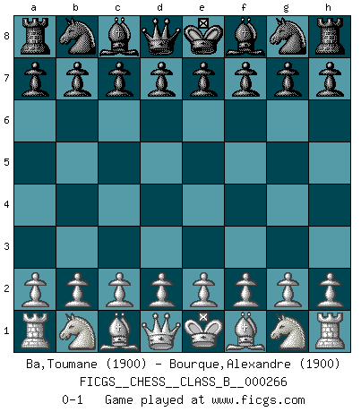 Last move : 0-1 2018 April 9 20:35:37 [Event "FICGS__CHESS__CLASS_B__000266"] [Site "FICGS"] [Date "2018.02.28"] [Round "1"] [White "Ba,Toumane"] [Black "Bourque,Alexandre"] [Result "0-1"] [WhiteElo "1900"] [BlackElo "1900"] 0-1 This chess game has been lost on time (started : 2018.02.28 19:28:7) Player Black won this chess game. Follow this game move after move (download)Chess is in its essence a game, in its form an art, and in its execution a science. (Baron Tassilo) Bogoljubow: Matt in vier Zügen! Tartakower: Ich verbitte mir jede Belästigung! (Savielly Grigorievitsch Tartakower) El Ajedrez, como cualquier otra actividad creativa, puede existir solo a través de méritos combinados de aquellos que tienen talento creativo y de aquellos que tienen la habilidad de organizar un trabajo creativo. (Mikhail Botvinnik) La vérité est comme le meilleur coup aux échecs : elle existe, mais il faut la chercher. (Arturo Perez-Reverte) Either move or be moved. (Ezra Pound)