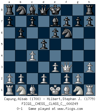 Last move : 0-1 2018 May 29 0:20:14 [Event "FICGS__CHESS__CLASS_C__000249"] [Site "FICGS"] [Date "2018.03.01"] [Round "1"] [White "Capung,Albab"] [Black "Hilbert,Stephan J."] [Result "0-1"] [WhiteElo "1700"] [BlackElo "1779"] 1.e3 Nf6 2.c3 e6 3.h3 b6 4.Qf3 d5 5.c4 Be7 0-1 This chess game has been lost on time (started : 2018.03.01 0:58:1) Van't Kruijs Opening Player Black won this chess game. Follow this game move after move (download)The mistakes are there, waiting to be made. (Savielly Tartakower) Kein Schachspieler kann gut schlafen. (H. G. Wells) En la vida, como en el Ajedrez, los Peones propios obstruyen nuestro camino. La gran fortuna de un hombre, su comodidad, placer, hijos, libros, que deberían ayudarle a ganar, con mucha frecuencia lo ponen en Jaque Mate. (Charles Buxton) Les échecs, c'est la lutte contre l'erreur. (Johannes Zukertort) Your best chance to get a Royal Flush in a casino is in the bathroom. (Anonymous)