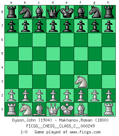 Last move : 1-0 2018 April 11 8:50:16 [Event "FICGS__CHESS__CLASS_C__000249"] [Site "FICGS"] [Date "2018.03.01"] [Round "1"] [White "Dyson,John"] [Black "Makhanov,Roman"] [Result "1-0"] [WhiteElo "1904"] [BlackElo "1800"] 1.Nf3 1-0 This chess game has been lost on time (started : 2018.03.01 0:58:1) Reti Opening Player White won this chess game. Follow this game move after move (download)We cannot resist the fascination of sacrifice, since a passion for sacrifices is part of a Chessplayer's nature. (Rudolf Spielman) Ich tröste mich mit dem Vergnügen, daß Schachfans, Zuschauer und Leser glücklich sind, wenn ein Großmeister etwas riskiert, statt nur Klötzchen zu schieben. (Mikhail Nekhemyevich Tal) Aquel que ve no otra dirección en el juego que la de dar Jaque Mate a su oponente, nunca será un buen jugador de Ajedrez. (Euwe) Le pion, dans sa simplicité, marche droit devant lui, mais lorsqu'il prend, il le fait obliquement? Ainsi l'homme, tant qu'il reste pauvre, marche dans la droiture et vit honnêtement, mais lorsqu'il recherche les honneurs, il flatte, se parjure et, par les voies obliques, cherche une position supérieure sur l'échiquier du monde. (Jean de Galles) Difficult things take a long time, impossible things a little longer. (Author unknown)