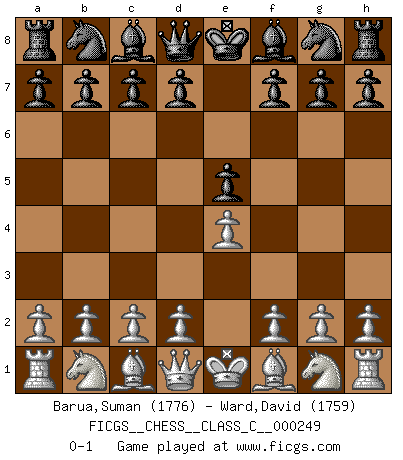 Last move : 0-1 2018 April 10 20:48:9 [Event "FICGS__CHESS__CLASS_C__000249"] [Site "FICGS"] [Date "2018.03.01"] [Round "1"] [White "Barua,Suman"] [Black "Ward,David"] [Result "0-1"] [WhiteElo "1776"] [BlackElo "1759"] 1.e4 e5 0-1 This chess game has been lost on time (started : 2018.03.01 0:58:1) King's pawn game Player Black won this chess game. Follow this game move after move (download)When your house is on fire, you can't be bothered with the neighbors. Or, as we say in Chess, if your King is under attack you don't worry about losing a Pawn on the Queen's side. (Gary Kasparov) Sehr viele beherrschen heutzutage das große Einmalseins des Schachspiels und kennen sogar dessen Logarithmentafeln auswendig - deshalb sollte man hin und wieder zu beweisen trachten, dass zwei mal zwei auch fünf sein kann. (Mikhail Nekhemyevich Tal) El Ajedrez es un regaderazo frío para la mente. (Sir John Simon) On a dit que l'homme se distingue de l'animal par le fait qu'il achète plus de livres qu'il ne peut en lire. Je voudrais suggérer qu'inclure à la liste des livres quelques livres d'échecs rendrait la distinction manifeste. (Edward Lasker) Follow your passion, and success will follow you. (Arthur Buddhold)