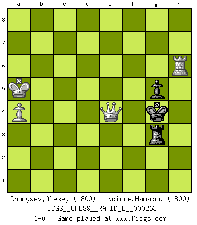 Last move : 1-0 2018 March 6 18:58:56 [Event "FICGS__CHESS__RAPID_B__000263"] [Site "FICGS"] [Date "2018.03.01"] [Round "1"] [White "Churyaev,Alexey"] [Black "Ndione,Mamadou"] [Result "1-0"] [WhiteElo "1800"] [BlackElo "1800"] 1.e4 e5 2.Nf3 Nc6 3.b3 g6 4.Bb2 Bg7 5.c3 d6 6.g3 Nf6 7.d3 Bg4 8.h3 Bd7 9.Bg2 h6 10.Nbd2 Be6 11.Qe2 Qd7 12.a3 g5 13.d4 exd4 14.cxd4 d5 15.e5 Ng8 16.Rc1 Nge7 17.g4 Ng6 18.Qb5 Rb8 19.Bf1 a6 20.Qa4 Nf4 21.b4 f5 22.exf6 Bxf6 23.Nb3 Qd6 24.Nc5 Bf7 25.Nxb7 Rxb7 26.Qxc6+ Qxc6 27.Rxc6 Ke7 28.Rxa6 Rb6 29.Ra7 Kd6 30.b5 Bg6 31.Kd2 Be4 32.Ke3 Re8 33.a4 Bd3 34.Ne5 Bxf1 35.Rxf1 c5 36.Ba3 Rxe5+ 37.dxe5+ Kxe5 38.Bxc5 Re6 39.Kd2 d4 40.b6 Kd5 41.b7 Re2+ 42.Kd1 Rb2 43.Ba3 Rb1+ 44.Kc2 Rxf1 45.b8Q Rxf2+ 46.Kb3 Rf3+ 47.Kb4 Nd3+ 48.Ka5 Ke4 49.Qe8+ Ne5 50.Bd6 d3 51.Bxe5 Bxe5 52.Re7 d2 53.Rxe5+ Kd3 54.Qg6+ Kc3 55.Rc5+ Kd4 56.Qd6+ Ke3 57.Re5+ Kf2 58.Qxd2+ Kg3 59.Re6 Kxh3 60.Rxh6+ Kxg4 61.Qg2+ Rg3 62.Qe4+ 1-0 King's pawn game Promotion Queen by player White (move 45) 10 pieces endgame at move 58 : White KQRPPP , Black KRPP WHITE : King + 1 Queen 1 Rook 3 Pawns BLACK : King + 1 Rook 2 Pawns 9 pieces endgame at move 59 : White KQRPP , Black KRPP WHITE : King + 1 Queen 1 Rook 2 Pawns BLACK : King + 1 Rook 2 Pawns 8 pieces endgame at move 60 : White KQRPP , Black KRP WHITE : King + 1 Queen 1 Rook 2 Pawns BLACK : King + 1 Rook 1 Pawn 7 pieces endgame at move 60 : White KQRP , Black KRP WHITE : King + 1 Queen 1 Rook 1 Pawn BLACK : King + 1 Rook 1 Pawn Player White won this chess game. Follow this game move after move (download)Adequate compensation for a sacrifice is having a sound combination leading to a winning position; adequate compensation for a blunder is having your opponent snatch defeat from the jaws of victory. (Bruce A. Moon) Irgendwie scheint mir sonntags früh um 9 Uhr der Killerinstinkt verloren gegangen zu sein. (Alexej Shirov) No hay precio que no valga la pena por la cabellera del Rey enemigo. (Koblentz) Les pièces de l'échiquier étaient impitoyables. Elles le retenaient, elles l'absorbaient. Il y avait de l'horreur en cela, mais aussi une harmonie unique. Car, qu'y a-t-il dans le monde, à part les échecs ? (V. Nabokov) Do you know these so called Volunteers don't even get paid! (Simpsons)