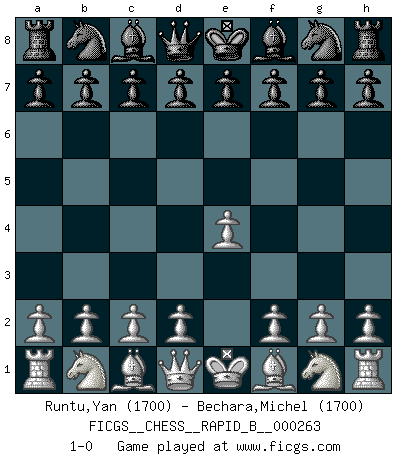 Last move : 1-0 2018 May 6 10:40:8 [Event "FICGS__CHESS__RAPID_B__000263"] [Site "FICGS"] [Date "2018.04.06"] [Round "1"] [White "Runtu,Yan"] [Black "Bechara,Michel"] [Result "1-0"] [WhiteElo "1700"] [BlackElo "1700"] 1.e4 1-0 This chess game has been lost on time (started : 2018.04.06 2:34:36) King's pawn Opening Player White won this chess game. Follow this game move after move (download)I believe that Chess possesses a magic that is also a help in advanced age. A rheumatic knee is forgotten during a game of Chess and other events can seem quite unimportant in comparison with a catastrophe on the chessboard. (Vlastimil Hort) Je mehr wir mit Computern analysieren, desto mehr glauben wir an Verteidigung. (Vladimir Kramnik) Los problemas de Ajedrez exigen del compositor las mismas virtudes que caracterizan todo el arte de valor: originalidad, invención, concisión, armonía, complejidad e insinceridad explendida. (Vladimir Nabokov) Les Echecs sont et restent toujours un combat, un combat intégral comme la boxe, la lutte ou un autre sport, et où il doit y avoir un vainqueur et un vaincu. (Joseph Emil Diemer) Success without honor is an unseasoned dish; it will satisfy your hunger, but it won't taste good. (Joe Paterno)