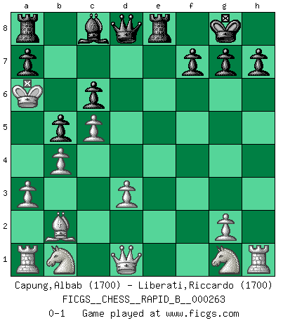 Last move : 0-1 2018 March 21 19:14:9 [Event "FICGS__CHESS__RAPID_B__000263"] [Site "FICGS"] [Date "2018.03.01"] [Round "1"] [White "Capung,Albab"] [Black "Liberati,Riccardo"] [Result "0-1"] [WhiteElo "1700"] [BlackElo "1700"] 1.e3 e5 2.c4 Nc6 3.a3 Nf6 4.b4 d5 5.Bb2 Bd6 6.c5 Be7 7.Bb5 e4 8.d3 O-O 9.h4 d4 10.Bxc6 dxe3 11.Bxe4 exf2+ 12.Kxf2 Nxe4+ 13.Ke3 Bg5+ 14.hxg5 Qxg5+ 15.Kxe4 Re8+ 16.Kd4 Qf6+ 17.Kc4 Be6+ 18.Kb5 c6+ 19.Ka4 b5+ 20.Ka5 Qd8+ 21.Ka6 Bc8+ 0-1 Van't Kruijs Opening Kingside Castling by player Black (move 8) Player Black won this chess game. Follow this game move after move (download)In Chess, at least, the brave inherit the earth. (Edmar Mednis) Ein Kibitz ist einer, der deinem Gegner gute Ratschläge gibt. (Andrew Soltis) Una buena ofensiva y una buena defensa, comienzan ambas con un buen desarrollo. (Bruce A. Moon) Le génie consiste à savoir transgresser les règles au moment opportun. (Teichmann) The human is the only animal species whose members are able to talk themselves into difficulties that would not otherwise exist. (Wendell Johnson)