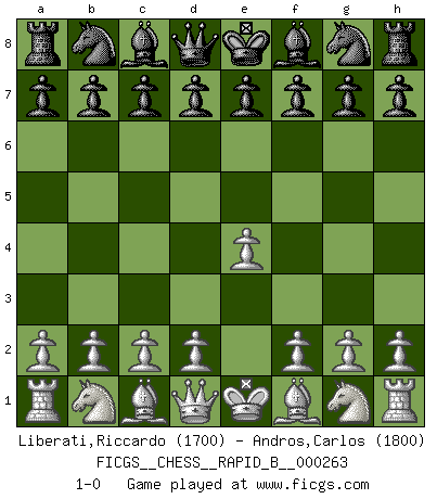 Last move : 1-0 2018 March 31 19:48:42 [Event "FICGS__CHESS__RAPID_B__000263"] [Site "FICGS"] [Date "2018.03.01"] [Round "1"] [White "Liberati,Riccardo"] [Black "Andros,Carlos"] [Result "1-0"] [WhiteElo "1700"] [BlackElo "1800"] 1.e4 1-0 This chess game has been lost on time (started : 2018.03.01 2:7:15) King's pawn Opening Player White won this chess game. Follow this game move after move (download)Good positions don't win games, good moves do. (Gerald Abrahams) Ich würde die 30 stärksten Spieler der USA im Simultanspiel besiegen. (José Raúl Capablanca) En posiciones complicadas, Bobby Fischer pocas veces tuvo que temer de cualquiera. (Paul Keres) Il vaut mieux sacrifier les pièces de l'adversaire. (Xavier Tartacover) SEO proverb : Make your website optimized for human beings, not for search engines.