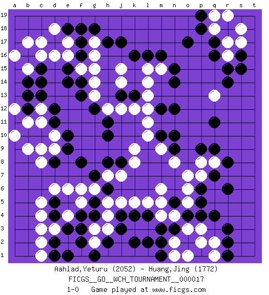 Last move : 1-0 2018 October 26 9:2:7 [Event "FICGS__GO__WCH_TOURNAMENT__000017"] [Site "FICGS"] [Date "2018.03.01"] [Round "1"] [Black "Aahlad,Yeturu"] [White "Huang,Jing"] [Result "1-0"] [Rating 1 "2052"] [Rating 2 "1772"] 1.q16 d16 2.q4 d3 3.d5 c5 4.d4 c4 5.e3 e2 6.d2 c3 7.f2 d6 8.f4 f5 9.g4 e6 10.c14 c12 11.d12 c11 12.f16 f15 13.e15 e16 14.e14 g16 15.f17 g17 16.e18 d18 17.g18 e17 18.f18 c17 19.j17 g14 20.c15 c16 21.d11 d10 22.c10 c9 23.b10 b9 24.e10 d9 25.g12 j15 26.l16 l14 27.j13 j14 28.k13 l15 29.m16 l13 30.r14 q13 31.n14 l11 32.n12 k12 33.f14 g15 34.c13 b11 35.b12 a10 36.q9 o3 37.r6 q2 38.n3 n4 39.m3 m4 40.o2 p2 41.o4 p3 42.l4 l3 43.l2 k3 44.k2 n2 45.m2 o5 46.p4 l5 47.k4 k5 48.j4 m6 49.r3 o1 50.h6 j5 51.m12 l12 52.n5 m5 53.h10 k9 54.r2 q1 55.q11 r17 56.q17 q18 57.p18 r16 58.r15 s18 59.s16 s17 60.s15 r19 61.p19 q19 62.o17 e4 63.e1 h5 64.g5 g6 65.g7 f6 66.b16 b17 67.e9 h4 68.j3 h3 69.h2 g3 70.f3 h7 71.h8 j7 72.n10 m9 73.j8 k8 74.f8 p7 75.q7 p8 76.p6 o6 77.p9 g2 78.g1 c2 79.m1 n1 80.h17 g13 81.f13 h12 82.h11 j12 83.d8 c8 84.p5 o7 85.n9 n8 86.r1 c1 87.d1 b15 88.b14 a16 89.m10 l10 90.k16 m15 91.n15 q8 92.r8 a12 93.b13 1-0 Here are the names of the openings (joseki) played in the four corners : Corner d4 : d3 d5 Komoku (Somok, Xiao~mu`) 3-4 Point. The komoku (3-4) point is the traditional corner enclosure move.. Ikken Takagakari (Hankan Nop'dakeolch'im, Yi Gaogua`jiao~, 1-Space High Approach). The 5-4 approach move has become more popular in modern times, as modern Go emphasizes speed and influence. Corner d16 : d16 c14 Hoshi (Hwajeom, Seongjeom, Xingwei`) 4-4 Point. The star or hoshi (4-4) point, emphasizing influence at the potential expense of territory. Ikken Kakari (Hankan Keolch'im, Yi Gua`jiao~, 1-Space Low Approach). Black 2 is the standard approach move to the 4-4. Player Black won this Go (weiqi, baduk) game. Follow this game move after move (download)To reduce an opponent's large prospective territory, strike at the shoulder. (Anonymous) All art requires courage. (Anne Tucker)