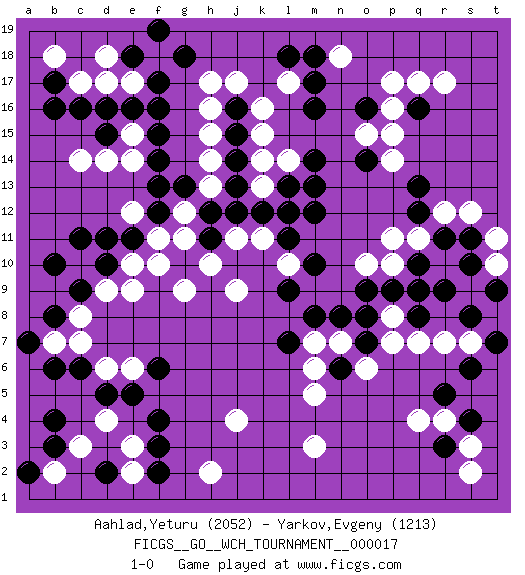 Last move : 1-0 2018 July 10 6:55:10 [Event "FICGS__GO__WCH_TOURNAMENT__000017"] [Site "FICGS"] [Date "2018.03.01"] [Round "1"] [Black "Aahlad,Yeturu"] [White "Yarkov,Evgeny"] [Result "1-0"] [Rating 1 "2052"] [Rating 2 "1213"] 1.q16 d4 2.c16 r4 3.c6 d9 4.f3 c14 5.e5 e17 6.d15 d14 7.f16 h17 8.f17 r10 9.f14 e15 10.e16 e14 11.f15 e3 12.f4 j4 13.b4 c3 14.b3 b2 15.f2 l17 16.d11 c10 17.c11 e10 18.e11 f11 19.f12 g11 20.d10 e9 21.c9 c8 22.b10 d17 23.d16 c17 24.b17 b18 25.b16 m3 26.b8 f18 27.g18 r17 28.e18 q17 29.o16 p17 30.m16 p16 31.o14 p15 32.m17 k15 33.l13 l14 34.m14 k13 35.k12 l12 36.m13 h13 37.j13 k14 38.h12 k11 39.j12 g12 40.g13 h14 41.j14 j11 42.h11 h10 43.j15 h15 44.j16 e12 45.f13 k16 46.g10 f10 47.l11 j17 48.m12 g9 49.l18 d18 50.f19 c7 51.b6 b7 52.a7 q7 53.q13 h16 54.l12 n18 55.m18 p10 56.l9 j9 57.d2 e2 58.a2 h2 59.l7 m5 60.r3 s3 61.s4 s2 62.n6 m6 63.n8 m7 64.m8 n7 65.o8 o15 66.q8 p8 67.p9 p7 68.q9 o10 69.o9 l10 70.m10 p14 71.q10 q11 72.r11 r12 73.s11 s12 74.q12 p11 75.s10 s9 76.s8 r7 77.o7 t11 78.r9 t10 79.t9 o6 80.r5 q4 81.s6 s7 82.t7 d6 83.d5 e6 84.f6 1-0 Here are the names of the openings (joseki) played in the four corners : Corner d4 : d4 c6 Hoshi (Hwajeom, Seongjeom, Xingwei`) 4-4 Point. The star or hoshi (4-4) point, emphasizing influence at the potential expense of territory. Ikken Kakari (Hankan Keolch'im, Yi Gua`jiao~, 1-Space Low Approach). Black 2 is the standard approach move to the 4-4. Corner d16 : c16 c14 Komoku (Somok, Xiao~mu`) 3-4 Point. The komoku (3-4) point is the traditional corner enclosure move.. Corner q16 : q16 l17 Hoshi (Hwajeom, Seongjeom, Xingwei`) 4-4 Point. The star or hoshi (4-4) point, emphasizing influence at the potential expense of territory. Player Black won this Go (weiqi, baduk) game. Follow this game move after move (download)Ikken tobi is never wrong. (Anonymous) Crush them ! Make them suffer ! (General Grievous in Star Wars ep.3)