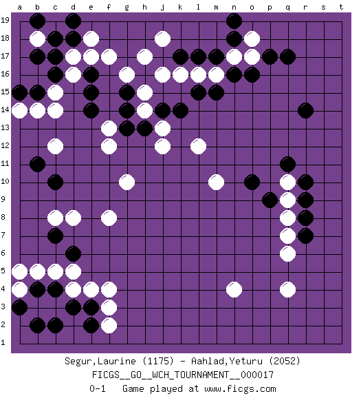 Last move : 0-1 2018 June 17 0:8:22 [Event "FICGS__GO__WCH_TOURNAMENT__000017"] [Site "FICGS"] [Date "2018.03.01"] [Round "1"] [Black "Segur,Laurine"] [White "Aahlad,Yeturu"] [Result "0-1"] [Rating 1 "1175"] [Rating 2 "2052"] 1.d3 d16 2.q17 q4 3.r14 c5 4.b4 b5 5.c4 e4 6.e3 f4 7.c7 d4 8.c10 f3 9.e2 f2 10.c2 c12 11.c17 d17 12.c16 c14 13.b15 b14 14.d18 e18 15.d19 f17 16.n16 b18 17.c18 c15 18.b19 f8 19.d6 d5 20.k17 a4 21.a3 a5 22.b2 d8 23.q11 g10 24.b11 c8 25.k14 n4 26.g14 j16 27.h16 h17 28.e14 f13 29.g13 f12 30.e15 g16 31.g15 k16 32.l17 h15 33.e16 e17 34.a15 a14 35.b17 j13 36.j14 h14 37.h13 j12 38.r7 l12 39.l15 l16 40.m15 m16 41.m17 n17 42.n18 o17 43.o16 o18 44.n19 j18 45.p17 q7 46.p9 q8 47.r8 q9 48.r9 q10 49.r10 q6 50.o10 m10 0-1 Here are the names of the openings (joseki) played in the four corners : Corner d4 : d3 c5 Komoku (Somok, Xiao~mu`) 3-4 Point. The komoku (3-4) point is the traditional corner enclosure move.. Ikken Kakari (Hankan Keolch'im, Yi Gua`jiao~, 1-Space Low Pincer). The small knight move is the basic approach move to the 3-4 point stone. It has been continually used for over four centuries. There are limitless variations, with new moves constantly being discovered. White 2 opens the door to a treaure store of joseki. Player White won this Go (weiqi, baduk) game. Follow this game move after move (download)There are players who don't accept exchange: they play many moves that perpetuate a previous state of the game. (Pierre Audouard) Players are not good because they find tactics, it is about the way to find the positions in which those tactics are hidden. (Luc-Olivier Leclerc)