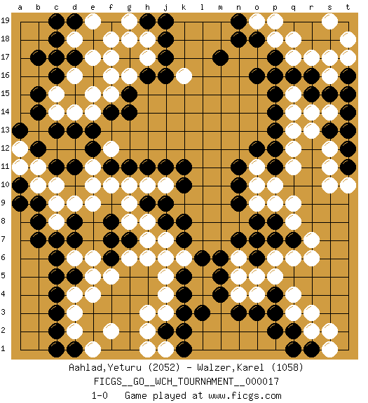 Last move : 1-0 2018 September 16 19:36:48 [Event "FICGS__GO__WCH_TOURNAMENT__000017"] [Site "FICGS"] [Date "2018.03.01"] [Round "1"] [Black "Aahlad,Yeturu"] [White "Walzer,Karel"] [Result "1-0"] [Rating 1 "2052"] [Rating 2 "1058"] 1.q16 d4 2.c16 q4 3.c6 c8 4.c3 d3 5.c4 d6 6.d5 e5 7.c5 e4 8.d7 e6 9.d8 d9 10.c7 c9 11.c13 d12 12.d13 c12 13.e12 e9 14.f8 e11 15.f11 f12 16.e13 f10 17.g11 j4 18.d11 e10 19.c11 g10 20.h11 h10 21.j11 j10 22.k11 k16 23.m17 e17 24.g17 c17 25.b17 g16 26.h16 h17 27.j17 h18 28.j16 f17 29.j18 f18 30.g15 f16 31.d17 d18 32.c18 e19 33.h19 g18 34.o3 r6 35.q2 r3 36.l3 q14 37.o16 q11 38.f7 j7 39.j2 h3 40.k10 h8 41.p12 q12 42.p13 q13 43.p14 o10 44.n11 o4 45.n3 n4 46.m4 r17 47.r16 q17 48.p17 s16 49.s15 s17 50.r15 p18 51.o18 q18 52.s13 s12 53.m6 h2 54.c2 d2 55.d1 e1 56.c1 f2 57.o6 p6 58.o8 q8 59.t12 s11 60.n10 o9 61.n9 r2 62.p8 q9 63.t11 t10 64.t13 s10 65.p3 o5 66.p7 q6 67.k3 n6 68.n7 o7 69.t16 s19 70.o6 n5 71.m5 e14 72.f14 e15 73.b7 g6 74.f6 f5 75.g7 h6 76.r1 s1 77.q1 q3 78.p2 r13 79.t15 t18 80.k8 c15 81.b15 c14 82.b14 d16 83.c17 d14 84.b12 k6 85.k7 j3 86.k2 f15 87.g14 o11 88.o12 s2 89.k5 j5 90.l6 j6 91.j8 h7 92.h9 g9 93.j9 g8 94.p4 p5 95.q7 r7 96.k4 q15 97.p15 o19 98.n19 p19 99.n18 p9 100.o7 b10 101.b8 g19 102.b9 c10 103.a10 a11 104.a9 b11 105.j19 a12 106.a13 s14 107.t14 r14 108.p11 t17 109.p16 p10 110.c19 j1 111.k1 h1 112.d19 1-0 Here are the names of the openings (joseki) played in the four corners : Corner d4 : d4 c6 Hoshi (Hwajeom, Seongjeom, Xingwei`) 4-4 Point. The star or hoshi (4-4) point, emphasizing influence at the potential expense of territory. Ikken Kakari (Hankan Keolch'im, Yi Gua`jiao~, 1-Space Low Approach). Black 2 is the standard approach move to the 4-4. Corner q4 : q4 o3 Hoshi (Hwajeom, Seongjeom, Xingwei`) 4-4 Point. The star or hoshi (4-4) point, emphasizing influence at the potential expense of territory. Ikken Kakari (Hankan Keolch'im, Yi Gua`jiao~, 1-Space Low Approach). Black 2 is the standard approach move to the 4-4. Player Black won this Go (weiqi, baduk) game. Follow this game move after move (download)If you don't know ladders, don't play go. (Anonymous) If you have any trouble condescending, find a Unix user to show you how it's done. (Scott Adams)