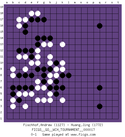 Last move : 0-1 2018 July 6 6:10:5 [Event "FICGS__GO__WCH_TOURNAMENT__000017"] [Site "FICGS"] [Date "2018.03.01"] [Round "1"] [Black "Fischhof,Andrew"] [White "Huang,Jing"] [Result "0-1"] [Rating 1 "1127"] [Rating 2 "1772"] 1.q16 d17 2.q3 d3 3.q6 k4 4.d6 e5 5.e6 d5 6.c6 c5 7.d15 d11 8.d12 c11 9.c12 d9 10.f9 f11 11.e12 f10 12.g9 f12 13.f13 g13 14.f14 c16 15.g14 h13 16.e17 e18 17.f17 f18 18.g17 h11 19.h14 k13 20.f5 f4 21.g5 g4 22.b5 b4 23.b6 h5 24.h6 j6 25.j5 h4 26.j7 g6 27.k6 f6 28.e8 h8 29.g8 h7 30.g7 j6 31.d16 c17 32.h6 j8 33.k8 j6 34.e11 e10 35.h6 h10 36.h9 j9 37.j10 k9 38.l8 j6 39.c4 b3 40.h6 k10 41.j6 f7 42.d8 b9 43.c8 b8 0-1 This go game has been lost on time (started : 2018.03.01 20:46:8) Here are the names of the openings (joseki) played in the four corners : Corner d4 : d3 d6 Komoku (Somok, Xiao~mu`) 3-4 Point. The komoku (3-4) point is the traditional corner enclosure move.. Niken Takagakari (Dukan Nop'dakeolch'im, E`r Gaojia, 2-Space High Approch). The great master Honinbo Shuei (1852-1906) favored the two-space high (niken taka-gakari) approach, especially in two stone handicap games. This approach move was very popular in the 1910s. Wu Qingyuan = Go Seigen frequently played this way, considering it a good "whole board" approach. In recent years, O Rissei has often used the two-space high approach. Corner d16 : d17 d15 Komoku (Somok, Xiao~mu`) 3-4 Point. The komoku (3-4) point is the traditional corner enclosure move.. Ikken Takagakari (Hankan Nop'dakeolch'im, Yi Gaogua`jiao~, 1-Space High Approach). The 5-4 approach move has become more popular in modern times, as modern Go emphasizes speed and influence. Player White won this Go (weiqi, baduk) game. Follow this game move after move (download)The game plays itself, the players don't control it. (Pierre Audouard) The Internet is so big, so powerful and pointless that for some people it is a complete substitute for life. (Andrew Brown)