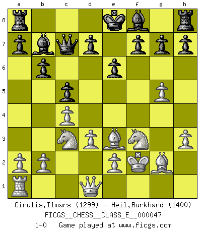 Last move : 1-0 2007 July 15 23:3:51 [Event "FICGS__CHESS__CLASS_E__000047"] [Site "FICGS"] [Date "2007.04.25"] [Round "1"] [White "Cirulis,Ilmars"] [Black "Heil,Burkhard"] [Result "1-0"] [WhiteElo "1299"] [BlackElo "1400"] 1.c4 c5 2.g4 Nc6 3.Nc3 e6 4.Nf3 Nf6 5.g5 Ng4 6.Rg1 Nce5 7.Rxg4 Nxg4 8.h3 Nxf2 9.Kxf2 b6 10.Bg2 Bb7 11.d3 Qc7 12.Be3 1-0 English : Symmetrical variation Player White won this chess game. Follow this game move after move (download)Every Pawn is a potential Queen. (James Mason) Nur ein wirklich starker Spieler weiß wie schwach er spielt. (Savielly Grigorievitsch Tartakower) El Ajedrez es parte de la cultura, y si una cultura esta en decadencia, entonces también el Ajedrez declinará. (Mikhail Botvinnik) Les Echecs sont affaire de jugement sensible. Savoir quand frapper et quand esquiver. (Fischer) The production of too many useful things results in too many useless people. (Karl Marx)