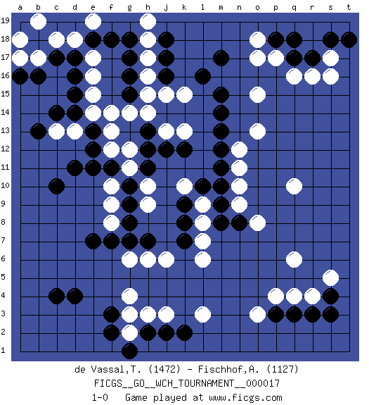 Last move : 1-0 2018 July 18 8:1:26 [Event "FICGS__GO__WCH_TOURNAMENT__000017"] [Site "FICGS"] [Date "2018.03.01"] [Round "1"] [Black "de Vassal,Thibault"] [White "Fischhof,Andrew"] [Result "1-0"] [Rating 1 "1472"] [Rating 2 "1127"] 1.d4 q4 2.d16 q16 3.c10 d13 4.g17 e16 5.d17 e17 6.d15 e15 7.d14 e14 8.e13 c13 9.c14 f13 10.e12 f14 11.d11 h16 12.j17 h17 13.j16 h18 14.m17 o17 15.m15 o15 16.j18 g4 17.c4 l3 18.e7 q10 19.r3 r4 20.q3 o3 21.p3 p4 22.s4 s5 23.s3 q6 24.r17 r16 25.q17 p17 26.p18 o18 27.q18 s17 28.s18 s16 29.t18 o13 30.m13 n12 31.m12 n11 32.m11 n10 33.m10 j15 34.m9 n9 35.m8 l6 36.n8 o8 37.k7 l7 38.k8 j6 39.h7 h6 40.g7 g6 41.g18 h19 42.e18 f12 43.f11 g11 44.h12 f10 45.e11 g12 46.h13 h14 47.g15 g14 48.g16 h15 49.l16 j13 50.j12 k13 51.k12 k15 52.m14 f8 53.g10 h10 54.g9 h9 55.g8 f9 56.f7 l8 57.k9 d18 58.f18 c18 59.c17 b17 60.b16 a18 61.b13 b19 62.a16 a17 63.f3 g3 64.f2 l9 65.h11 k10 66.l10 e19 67.h2 g2 68.g1 h3 69.j2 j3 70.k2 1-0 Here are the names of the openings (joseki) played in the four corners : Corner d16 : d16 d13 Hoshi (Hwajeom, Seongjeom, Xingwei`) 4-4 Point. The star or hoshi (4-4) point, emphasizing influence at the potential expense of territory. Niken Takagakari (Dukan Nop'dakeolch'im, E`r Gaojia, 2-Space High Approach). White 2 is a light approach move. Rarely played in even games, White 2 is typically employed in handicap games. Black continues with 6-4 or 3-10. In Korean Sunjang Baduk Black has a stone on 8-4. Corner q16 : q16 m17 Hoshi (Hwajeom, Seongjeom, Xingwei`) 4-4 Point. The star or hoshi (4-4) point, emphasizing influence at the potential expense of territory. Corner d4 : d4 g4 Hoshi (Hwajeom, Seongjeom, Xingwei`) 4-4 Point. The star or hoshi (4-4) point, emphasizing influence at the potential expense of territory. Niken Takagakari (Dukan Nop'dakeolch'im, E`r Gaojia, 2-Space High Approach). White 2 is a light approach move. Rarely played in even games, White 2 is typically employed in handicap games. Black continues with 6-4 or 3-10. In Korean Sunjang Baduk Black has a stone on 8-4. Player Black won this Go (weiqi, baduk) game. Follow this game move after move (download)Win the stones, lose the game. (Anonymous) If computers get too powerful, we can organize them into committees. That'll do them in. (Anonymous)
