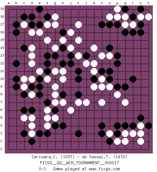 Last move : 0-1 2018 April 6 7:19:31 [Event "FICGS__GO__WCH_TOURNAMENT__000017"] [Site "FICGS"] [Date "2018.03.01"] [Round "1"] [Black "Cerisara,Christophe"] [White "de Vassal,Thibault"] [Result "0-1"] [Rating 1 "1097"] [Rating 2 "1472"] 1.q16 d4 2.q4 d16 3.r10 k17 4.k3 c10 5.k10 q7 6.p9 p8 7.q9 n7 8.n4 l7 9.f3 f4 10.g4 f5 11.e3 g5 12.h4 j6 13.c14 f10 14.b16 c17 15.b17 r17 16.r16 q17 17.p17 p18 18.o17 o18 19.n17 k15 20.h16 j14 21.e17 e16 22.c18 f17 23.d18 e18 24.d17 f15 25.f18 g18 26.e19 g17 27.f12 e11 28.h12 m14 29.o14 n13 30.p12 o13 31.p13 h10 32.k8 k7 33.h8 h11 34.f13 g14 35.j13 k13 36.j12 o9 37.o10 n9 38.s17 s18 39.s16 d13 40.k11 m11 41.c6 c5 42.d6 d5 43.d9 d10 44.e9 g9 45.b9 g8 46.b12 d14 47.e10 d12 48.f7 g7 49.g6 h7 50.c3 d3 51.d2 c9 52.c8 d8 53.e8 f6 54.b10 r3 55.r4 q3 56.p3 p2 57.o2 o3 58.p4 q2 59.n3 s4 60.s5 s2 61.t4 s3 62.r18 q18 63.s19 t18 64.q19 p19 65.h14 h15 66.g13 j16 67.f11 g11 68.m10 n10 69.n11 m12 70.o11 m9 71.l13 l12 0-1 Comment by player 1 : Christophe Cerisara : Je viens de decouvrir l'expansodynamique grace a toi ! :-) Je remarque surtout que, selon cette théorie, tout mène à C# . Microsoft serait derrière tout cela que ca ne m'etonnerait pas ! ;-) Comment by player 2 : Thibault de Vassal : Hahaha :) Et en plus tu es curieux et courageux ! ^^ Thibault de Vassal Merci pour la partie... c'était vraiment tendu pendant longtemps, j'ai sans doute eu un peu de chance avec le centre. Here are the names of the openings (joseki) played in the four corners : Corner q4 : q4 q7 Hoshi (Hwajeom, Seongjeom, Xingwei`) 4-4 Point. The star or hoshi (4-4) point, emphasizing influence at the potential expense of territory. Niken Takagakari (Dukan Nop'dakeolch'im, E`r Gaojia, 2-Space High Approach). White 2 is a light approach move. Rarely played in even games, White 2 is typically employed in handicap games. Black continues with 6-4 or 3-10. In Korean Sunjang Baduk Black has a stone on 8-4. Corner d4 : d4 f3 Hoshi (Hwajeom, Seongjeom, Xingwei`) 4-4 Point. The star or hoshi (4-4) point, emphasizing influence at the potential expense of territory. Ikken Kakari (Hankan Keolch'im, Yi Gua`jiao~, 1-Space Low Approach). Black 2 is the standard approach move to the 4-4. Corner d16 : d16 c14 Hoshi (Hwajeom, Seongjeom, Xingwei`) 4-4 Point. The star or hoshi (4-4) point, emphasizing influence at the potential expense of territory. Ikken Kakari (Hankan Keolch'im, Yi Gua`jiao~, 1-Space Low Approach). Black 2 is the standard approach move to the 4-4. Corner q16 : q16 r17 Hoshi (Hwajeom, Seongjeom, Xingwei`) 4-4 Point. The star or hoshi (4-4) point, emphasizing influence at the potential expense of territory. Player White won this Go (weiqi, baduk) game. Follow this game move after move (download)Never try to cut bamboo joints. (Anonymous) Inventor: A person who makes an ingenious arrangement of wheels, levers and springs, and believes it civilization. (Ambrose Bierce, The Devil's Dictionary)