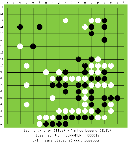 Last move : 0-1 2018 April 6 7:0:54 [Event "FICGS__GO__WCH_TOURNAMENT__000017"] [Site "FICGS"] [Date "2018.03.01"] [Round "1"] [Black "Fischhof,Andrew"] [White "Yarkov,Evgeny"] [Result "0-1"] [Rating 1 "1127"] [Rating 2 "1213"] 1.q16 d4 2.c16 r3 3.q4 r4 4.q5 p2 5.p3 o3 6.o2 q2 7.o4 n3 8.n2 m3 9.m2 l3 10.l2 k3 11.k2 j3 12.j2 h2 13.h1 g2 14.g1 j1 15.k1 f1 16.j1 f2 17.f16 d10 18.p10 o17 19.o16 n16 20.o15 p17 21.q17 k17 22.q14 c13 23.e13 r7 24.r5 p7 25.o6 o7 26.n7 n8 27.m6 n5 28.m5 n6 29.m7 n4 30.o5 m8 31.k7 l8 32.k6 r10 33.o8 o9 34.p8 p9 35.q8 q7 36.q9 q10 37.n9 o10 38.n10 p11 39.o11 p10 40.m11 k8 41.j8 j9 42.k9 h8 43.j7 h5 44.s5 d7 45.h7 g9 0-1 Here are the names of the openings (joseki) played in the four corners : Corner q4 : r3 q4 San-San (Sam-Sam, San-San) 3-3 Point. The San-San (3-3) point, emphasizing territory at the expense of influence. Kata-tsuki (shoulder hit). The shoulder-hit is the traditional answer to the 3-3. The direction of White 3 depends on the positions on the side. Crawling once may be the premise for a follow-up move of sliding with a knight's move in the opposite direction. If White plays 3 at 3-4 (to the right), the follow-on knight's move is then played at the top (e.g. 3-4, 4-5, 5-2). White's knight's move reduces territory potential on the side it is played. Corner q16 : q16 o17 Hoshi (Hwajeom, Seongjeom, Xingwei`) 4-4 Point. The star or hoshi (4-4) point, emphasizing influence at the potential expense of territory. Ikken Kakari (Hankan Keolch'im, Yi Gua`jiao~, 1-Space Low Approach). White 2 is the standard approach move to the 4-4. Player White won this Go (weiqi, baduk) game. Follow this game move after move (download)Go is to western chess what philosophy is to double entry accounting. (from Shibumi, by Trevanian) A good book on your shelf is a friend that turns its back on you and remains a friend. (Author unknown)