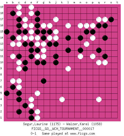 Last move : 0-1 2018 April 4 21:23:0 [Event "FICGS__GO__WCH_TOURNAMENT__000017"] [Site "FICGS"] [Date "2018.03.01"] [Round "1"] [Black "Segur,Laurine"] [White "Walzer,Karel"] [Result "0-1"] [Rating 1 "1175"] [Rating 2 "1058"] 1.c4 q17 2.c16 q4 3.f17 d16 4.c17 d17 5.d15 e16 6.g15 e15 7.e13 d14 8.c15 e14 9.d13 f14 10.g14 f13 11.e11 f11 12.f12 g12 13.e12 g13 14.j10 c14 15.b14 c13 16.f10 g11 17.g10 b13 18.a15 c10 19.c11 b11 20.d10 c9 21.d9 c7 22.b6 c6 23.c5 b7 24.a5 e4 25.d3 e3 26.e2 f2 27.e1 f1 28.c2 f5 29.j13 h14 30.h15 j14 31.h13 j15 32.j11 h16 33.f16 g16 34.f15 j17 35.f18 e18 36.d18 c18 37.d19 e19 38.b18 c19 39.r16 r17 40.q16 p16 41.r14 p14 42.s17 q10 43.r11 r10 44.q12 k4 45.g7 l9 46.l12 n11 47.l14 l16 48.n14 n16 49.o15 o16 50.p15 o13 51.n12 p11 0-1 Here are the names of the openings (joseki) played in the four corners : Corner d4 : c4 c9 Komoku (Somok, Xiao~mu`) 3-4 Point. The komoku (3-4) point is the traditional corner enclosure move.. Corner q16 : q17 r16 Komoku (Somok, Xiao~mu`) 3-4 Point. The komoku (3-4) point is the traditional corner enclosure move.. Player White won this Go (weiqi, baduk) game. Follow this game move after move (download)Everything would seem to be possible in Go. Like pulling a rabbit, by a magical move, out of a hat. (Pierre Audouard) Memory is a crazy woman that hoards colored rags and throws away food. (Austin O'Malley)
