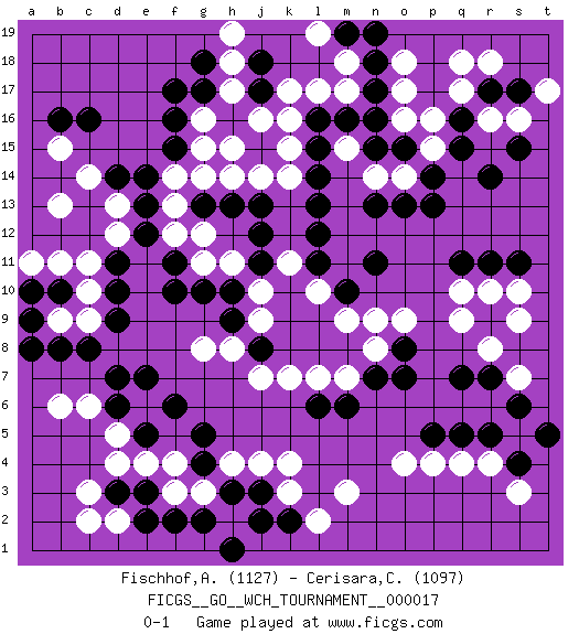 Last move : 0-1 2018 July 17 19:54:17 [Event "FICGS__GO__WCH_TOURNAMENT__000017"] [Site "FICGS"] [Date "2018.03.01"] [Round "1"] [Black "Fischhof,Andrew"] [White "Cerisara,Christophe"] [Result "0-1"] [Rating 1 "1127"] [Rating 2 "1097"] 1.q16 d4 2.c16 q4 3.f16 k3 4.g4 c6 5.d10 l17 6.j17 o17 7.r14 q17 8.r17 q18 9.q7 o4 10.d3 c3 11.e3 q9 12.q11 o9 13.o7 n8 14.n7 m7 15.o8 n9 16.p5 p4 17.q5 r4 18.r5 r8 19.r7 s7 20.s6 s9 21.m6 l7 22.l6 k7 23.j3 k4 24.s4 s3 25.t5 d13 26.c8 c11 27.d7 e6 28.d6 d5 29.e7 e4 30.f6 f3 31.f2 f4 32.g2 g3 33.h3 h4 34.g5 j4 35.e5 d2 36.e2 c2 37.k2 l2 38.j2 m3 39.h1 g8 40.f10 f12 41.h10 j9 42.g13 g11 43.g10 h11 44.j11 j10 45.j12 c14 46.f11 g12 47.e12 f13 48.e13 f14 49.e14 g14 50.h13 h15 51.j15 g16 52.g17 h17 53.f17 h18 54.j18 j14 55.j13 h14 56.l13 k14 57.l12 m15 58.l14 k15 59.n13 n14 60.o13 o14 61.p13 b15 62.b16 b9 63.b8 c9 64.d9 b6 65.b10 c10 66.a9 b11 67.a10 a11 68.a8 b13 69.d14 d12 70.d11 r18 71.s17 q10 72.r11 r10 73.s11 s10 74.n11 l10 75.m10 m9 76.l11 k11 77.h9 h8 78.j8 j7 79.l15 j16 80.l16 k17 81.m16 m17 82.n16 o16 83.o15 p15 84.n15 p16 85.p14 r16 86.q15 s16 87.s15 t17 88.n17 o18 89.n18 m18 90.m19 l19 91.n19 k16 92.g18 h19 93.f15 g15 0-1 Here are the names of the openings (joseki) played in the four corners : Corner d4 : d4 g4 Hoshi (Hwajeom, Seongjeom, Xingwei`) 4-4 Point. The star or hoshi (4-4) point, emphasizing influence at the potential expense of territory. Niken Takagakari (Dukan Nop'dakeolch'im, E`r Gaojia, 2-Space High Approach). Black 2 is a light approach move. Rarely played in even games, Black 2 is typically employed in handicap games. White continues with 6-4 or 3-10. In Korean Sunjang Baduk White has a stone on 8-4. Corner q16 : q16 l17 Hoshi (Hwajeom, Seongjeom, Xingwei`) 4-4 Point. The star or hoshi (4-4) point, emphasizing influence at the potential expense of territory. Corner q4 : q4 q7 Hoshi (Hwajeom, Seongjeom, Xingwei`) 4-4 Point. The star or hoshi (4-4) point, emphasizing influence at the potential expense of territory. Niken Takagakari (Dukan Nop'dakeolch'im, E`r Gaojia, 2-Space High Approach). Black 2 is a light approach move. Rarely played in even games, Black 2 is typically employed in handicap games. White continues with 6-4 or 3-10. In Korean Sunjang Baduk White has a stone on 8-4. Player White won this Go (weiqi, baduk) game. Follow this game move after move (download)Don't make dango's. (Anonymous) When the going gets tactical, the computers get going. (Hyatt)