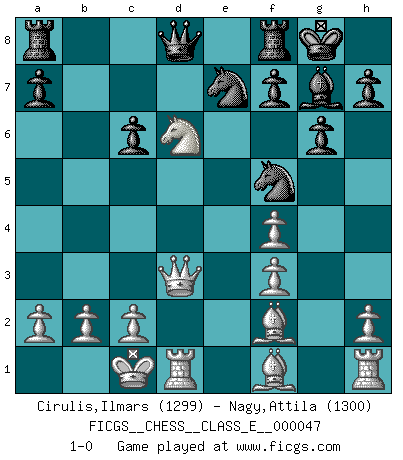 Last move : 1-0 2007 September 25 15:55:8 [Event "FICGS__CHESS__CLASS_E__000047"] [Site "FICGS"] [Date "2007.04.25"] [Round "1"] [White "Cirulis,Ilmars"] [Black "Nagy,Attila"] [Result "1-0"] [WhiteElo "1299"] [BlackElo "1300"] 1.f4 g6 2.Nf3 Bg7 3.Nc3 d6 4.e4 Nc6 5.d4 Bg4 6.Be3 Bxf3 7.gxf3 e6 8.d5 exd5 9.exd5 Nce7 10.Qd3 Nf5 11.O-O-O Nge7 12.Bf2 O-O 13.Ne4 c6 14.dxc6 bxc6 15.Nxd6 1-0 This chess game has been lost on time (started : 2007.04.25 14:49:23) Bird's Opening Queenside Castling by player White (move 11) Kingside Castling by player Black (move 12) Player White won this chess game. Follow this game move after move (download)On the chessboard, lies and hypocrisy do not survive long. (Emanuel Lasker) Das Schachspiel ist ein See, in welchem eine Mücke baden und ein Elefant ertrinken kann. (Emanuel Lasker) Solo los afeminados hacen el Enroque. (Rob Sillars) Pour moi, les échecs ne sont pas un jeu mais un art. (Alexandre Alekhine) I teach you to lie, cheat and steal, and as soon as my back's turned you wait in line ? (Gregory House, House M.D.)
