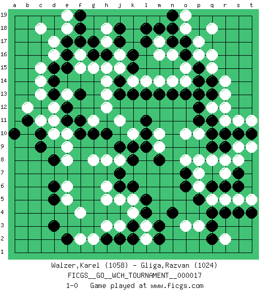 Last move : 1-0 2018 June 19 14:24:37 [Event "FICGS__GO__WCH_TOURNAMENT__000017"] [Site "FICGS"] [Date "2018.03.01"] [Round "1"] [Black "Walzer,Karel"] [White "Gliga,Razvan"] [Result "1-0"] [Rating 1 "1058"] [Rating 2 "1024"] 1.d3 d16 2.q4 q16 3.d5 k4 4.m3 f4 5.c9 d11 6.d14 c14 7.d15 c15 8.e16 d17 9.e17 e18 10.f18 e19 11.f17 c18 12.d13 c13 13.e11 d12 14.e12 d10 15.d8 e9 16.k16 m17 17.l17 r5 18.r4 q5 19.p5 p6 20.o6 p7 21.o7 p8 22.q10 r11 23.r9 o10 24.p11 o8 25.q13 r13 26.p15 q15 27.o17 p17 28.o16 o18 29.n18 o19 30.n19 q18 31.n17 m16 32.l13 m14 33.m13 n14 34.o13 l14 35.k13 k14 36.j14 j15 37.k15 j16 38.j17 h14 39.j13 h13 40.n13 o14 41.p14 h17 42.j18 h18 43.m18 p16 44.q14 r14 45.q6 r8 46.r6 s5 47.s6 r7 48.s4 s9 49.s10 t9 50.r10 t5 51.s7 s8 52.t4 p10 53.q11 q12 54.p12 r12 55.f19 g15 56.h16 h15 57.g16 f15 58.e15 f16 59.g17 o15 60.p13 n16 61.l18 h12 62.h10 j11 63.l10 g11 64.m8 m9 65.l9 m10 66.l11 s11 67.t10 t11 68.q9 q8 69.g10 g8 70.j9 k10 71.k9 e8 72.j2 f2 73.e2 e5 74.d6 e6 75.j6 h5 76.l5 o3 77.n4 r2 78.q2 p3 79.q3 l3 80.m2 l2 81.l4 k5 82.k6 j5 83.k3 j3 84.k2 h3 85.h2 g2 86.b11 b12 87.c10 c11 88.a10 j8 89.k8 h6 90.j7 h8 91.f10 e10 92.f11 e13 93.f13 1-0 Here are the names of the openings (joseki) played in the four corners : Player Black won this Go (weiqi, baduk) game. Follow this game move after move (download)There is no territory in the centre. (Anonymous) The hypothalamus is one of the most important parts of the brain, involved in many kinds of motivation, among other functions. The hypothalamus controls the 'Four Fs: Fighting, Fleeing, Feeding and Mating. (Unknown author)