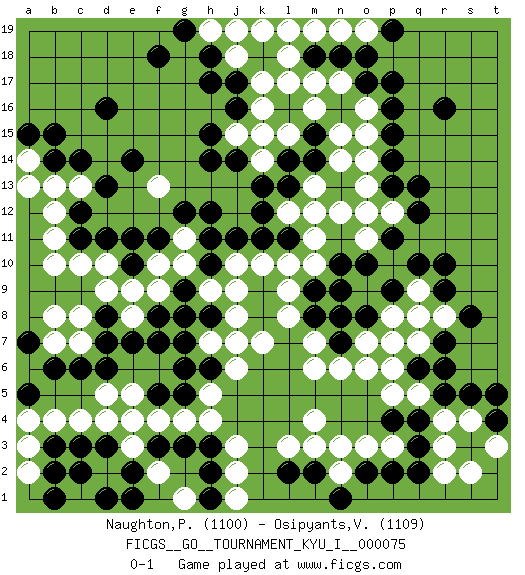 Last move : 0-1 2018 May 20 22:18:7 [Event "FICGS__GO__TOURNAMENT_KYU_I__000075"] [Site "FICGS"] [Date "2018.03.26"] [Round "1"] [Black "Naughton,Patrick"] [White "Osipyants,Vladimir"] [Result "0-1"] [Rating 1 "1100"] [Rating 2 "1109"] 1.r16 d4 2.d16 r4 3.p17 k16 4.r10 p3 5.c14 d10 6.h17 n17 7.f3 h4 8.h3 j3 9.f5 g4 10.g3 f4 11.d3 e3 12.e2 e4 13.c3 c4 14.b3 b4 15.c11 c10 16.d11 f10 17.r6 m4 18.k18 l17 19.m18 l18 20.q13 f13 21.h15 j18 22.h18 k17 23.n18 m17 24.o17 o14 25.o12 k10 26.j11 j10 27.k11 k14 28.m15 n14 29.m14 m13 30.l13 n12 31.l14 n15 32.j14 m16 33.k13 o16 34.p16 m11 35.o10 l10 36.m9 k7 37.h10 h9 38.g9 g10 39.h11 j8 40.e10 e9 41.e11 f9 42.g8 b10 43.f11 b12 44.c12 b13 45.b14 c13 46.d13 b11 47.e14 g11 48.g12 a14 49.a15 a13 50.b15 j2 51.h2 a3 52.b2 a2 53.h1 d2 54.d1 f2 55.e1 g1 56.c2 j1 57.b1 p5 58.p7 n6 59.n7 m7 60.m8 o7 61.o8 n8 62.n9 p6 63.n7 o6 64.q6 l8 65.q4 q5 66.r5 s4 67.q3 r3 68.q2 r2 69.p2 o3 70.o2 n2 71.m2 m3 72.n1 n3 73.l2 l3 74.s5 s2 75.t4 t3 76.t5 q7 77.r7 p8 78.q8 p7 79.p9 r8 80.s8 q9 81.r9 q8 82.q10 l9 83.n8 o13 84.p13 o11 85.p11 p12 86.q12 o12 87.p14 m19 88.o18 h19 89.g19 j19 90.j17 k19 91.f18 k15 92.p4 m6 93.n10 j15 94.h14 l12 95.h8 j9 96.d8 d9 97.f8 e8 98.e7 c8 99.d7 h7 100.f7 c7 101.c6 d5 102.d6 e5 103.b6 b7 104.a5 a4 105.a7 b8 106.g5 h5 107.h6 j6 108.g6 n19 109.g7 j7 110.l11 m10 111.k12 m12 112.j16 o19 113.p19 l19 114.p15 l15 115.h12 o15 116.pass pass 0-1 Here are the names of the openings (joseki) played in the four corners : Corner d4 : d4 f3 Hoshi (Hwajeom, Seongjeom, Xingwei`) 4-4 Point. The star or hoshi (4-4) point, emphasizing influence at the potential expense of territory. Ikken Kakari (Hankan Keolch'im, Yi Gua`jiao~, 1-Space Low Approach). Black 2 is the standard approach move to the 4-4. Player White won this Go (weiqi, baduk) game. Follow this game move after move (download)If White takes all four corners, Black should resign; if Black takes all four corners, Black should also resign. (David Kent) A good teacher is like a candle - it consumes itself to light the way for others. (Author unknown)