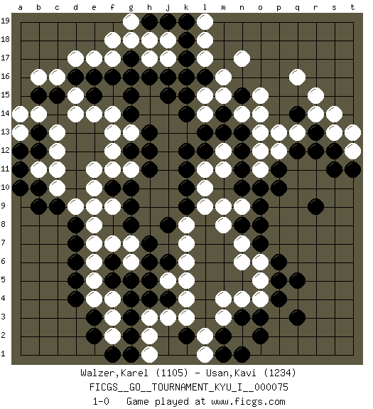 Last move : 1-0 2018 October 9 12:43:51 [Event "FICGS__GO__TOURNAMENT_KYU_I__000075"] [Site "FICGS"] [Date "2018.03.29"] [Round "1"] [Black "Walzer,Karel"] [White "Usan,Kavi"] [Result "1-0"] [Rating 1 "1105"] [Rating 2 "1234"] 1.d4 q16 2.q3 c16 3.q5 j17 4.e16 e17 5.d16 d17 6.c15 b16 7.b15 d15 8.f16 d14 9.b13 c13 10.b12 f13 11.g15 f17 12.g17 g18 13.j15 c10 14.b10 c12 15.c9 b11 16.a11 c11 17.b9 b14 18.a12 j3 19.g3 m3 20.r9 n17 21.q14 r14 22.r13 r15 23.k10 l10 24.k9 l9 25.k12 l11 26.k11 q13 27.q12 p13 28.r12 p12 29.n3 m4 30.h5 n4 31.o3 j5 32.g10 d9 33.d8 e9 34.m14 l15 35.k14 l14 36.h7 g6 37.h6 e6 38.d6 e8 39.d7 e7 40.g5 e5 41.d5 g11 42.f10 e11 43.n8 m8 44.p11 k8 45.j8 k7 46.l13 m15 47.n13 o11 48.p10 m12 49.m13 n9 50.o8 n7 51.o7 n6 52.o10 o14 53.n11 o12 54.n12 o13 55.k16 h17 56.g16 o6 57.p6 o4 58.p4 l17 59.h13 e4 60.e3 f11 61.h11 s13 62.s12 s14 63.n15 o15 64.k2 n2 65.o2 h2 66.g2 h3 67.m2 l2 68.n1 l1 69.m1 k3 70.f6 g7 71.g8 f7 72.f5 f4 73.g4 f3 74.e2 f2 75.f1 e10 76.j6 k6 77.j4 k5 78.h4 k4 79.k17 l18 80.k18 n14 81.l16 m16 82.n10 t12 83.t11 t13 84.s11 f14 85.g14 f9 86.g9 a14 87.e15 e14 88.g12 f12 89.o9 m9 90.h16 o5 91.p5 h1 92.g1 j18 93.j19 l19 94.j16 h18 95.k19 g13 96.h12 f18 97.h19 g19 98.l12 m11 99.k15 a13 100.a10 pass 101.pass 1-0 Here are the names of the openings (joseki) played in the four corners : Player Black won this Go (weiqi, baduk) game. Follow this game move after move (download)Take the cutting stone on the second line. (Anonymous) The quality of decision is like the well-timed swoop of a falcon which enables it to strike and destroy its victim. (Sun Tzu)