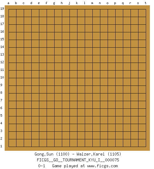 Last move : 0-1 2018 April 1 7:51:3 [Event "FICGS__GO__TOURNAMENT_KYU_I__000075"] [Site "FICGS"] [Date "2018.03.01"] [Round "1"] [Black "Gong,Sun"] [White "Walzer,Karel"] [Result "0-1"] [Rating 1 "1100"] [Rating 2 "1105"] 0-1 This go game has been lost on time (started : 2018.03.01 21:50:26) Here are the names of the openings (joseki) played in the four corners : Player White won this Go (weiqi, baduk) game. Follow this game move after move (download)Learning josekis by heart is useless if you don't try departing from them. (Pierre Audouard) Tree pose grows confidence. It roots me to this world. (Terri Guillemets)