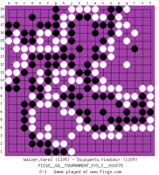 Last move : 0-1 2018 April 13 23:24:27 [Event "FICGS__GO__TOURNAMENT_KYU_I__000075"] [Site "FICGS"] [Date "2018.03.01"] [Round "1"] [Black "Walzer,Karel"] [White "Osipyants,Vladimir"] [Result "0-1"] [Rating 1 "1105"] [Rating 2 "1109"] 1.d3 q4 2.d16 r16 3.c6 d4 4.c4 d5 5.c5 e3 6.d2 f4 7.d10 c13 8.d13 b15 9.b17 c12 10.d12 d14 11.c15 c14 12.d15 e14 13.g16 p17 14.q16 q17 15.r14 q15 16.o16 p16 17.o17 o15 18.m16 q12 19.j16 o3 20.q6 q8 21.p7 p8 22.n6 l4 23.r5 r4 24.r7 r8 25.n4 n3 26.m8 n10 27.l5 k4 28.l11 m12 29.l12 j6 30.k8 g14 31.g12 f16 32.f17 e16 33.e17 e15 34.g7 j8 35.h8 h7 36.j9 g8 37.j7 h6 38.g9 d6 39.d7 e7 40.e8 d8 41.c7 f8 42.e9 f7 43.c11 b16 44.c16 g15 45.m13 n12 46.j13 b11 47.b10 b12 48.n15 o14 49.m4 m3 50.k6 k5 51.l6 h16 52.g17 h15 53.j15 h17 54.j17 h18 55.g18 l19 56.d18 j18 57.k18 k19 58.l18 m18 59.m17 n18 60.o18 p18 61.p19 q19 62.o19 j19 63.f13 f14 64.g1 h2 65.h1 g2 66.f1 j1 67.f2 f3 68.e2 j3 69.p5 s4 70.s5 t5 71.t6 t4 72.s8 s9 73.s7 t8 74.n13 o13 75.p4 p3 76.o8 p9 77.m10 n9 78.n8 m9 79.l9 m11 80.l10 o9 81.a16 b14 82.g13 j14 83.k14 a10 84.a9 a11 85.b9 f9 86.f10 e11 87.e13 e10 88.d9 g10 89.f11 g11 90.f12 h9 91.j8 j10 92.j12 j11 93.h14 h11 94.k11 h12 95.h13 q7 96.q5 o4 97.o5 n14 98.m14 a15 99.a17 t9 100.n17 m19 101.g19 t7 102.s6 k10 0-1 Here are the names of the openings (joseki) played in the four corners : Corner d16 : d16 c13 Hoshi (Hwajeom, Seongjeom, Xingwei`) 4-4 Point. The star or hoshi (4-4) point, emphasizing influence at the potential expense of territory. Niken Kakari (Dukan Keolch'im, E`r Gua`jiao~, 2-Space Low Approach). Black typically answers by 7-3 or 3-5 (which is not joseki). Player White won this Go (weiqi, baduk) game. Follow this game move after move (download)When in doubt, remove the enemy stones from the board. (Bill Taylor) Always be a first-rate version of yourself, instead of a second-rate version of somebody else. (Judy Garland)