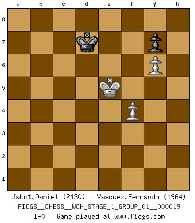 Last move : 1-0 2018 August 31 21:26:44 [Event "FICGS__CHESS__WCH_STAGE_1_GROUP_01__000019"] [Site "FICGS"] [Date "2018.03.02"] [Round "1"] [White "Jabot,Daniel"] [Black "Vasquez,Fernando"] [Result "1-0"] [WhiteElo "2130"] [BlackElo "1964"] 1.e4 e5 2.Nf3 Nf6 3.Nxe5 d6 4.Nf3 Nxe4 5.d4 d5 6.Bd3 Be7 7.O-O Nc6 8.c4 Nb4 9.Be2 dxc4 10.Bxc4 O-O 11.Nc3 Nd6 12.Bb3 Bf6 13.Ne5 c6 14.a3 Na6 15.Bf4 Nc7 16.Ng4 Bg5 17.Be5 Nf5 18.Qd3 Ne6 19.Rad1 Nf4 20.Bxf4 Bxf4 21.Rfe1 Qh4 22.h3 Bc7 23.Ne5 Nd6 24.Qe3 Bf5 25.g4 Bg6 26.Kg2 Ba5 27.Re2 Rae8 28.Qf3 Qf6 29.Qg3 Qd8 30.Rde1 Nb5 31.Rd1 Nd6 32.a4 Bxc3 33.bxc3 Be4+ 34.Kf1 Kh8 35.Rde1 f5 36.g5 Bd5 37.c4 Ne4 38.Ng6+ Kg8 39.Qh4 hxg6 40.cxd5 cxd5 41.f3 Nd6 42.Bxd5+ Nf7 43.Be6 Qd6 44.Kg2 Re7 45.d5 Rfe8 46.Qc4 Rc7 47.Qd3 Rce7 48.h4 Kf8 49.h5 Qf4 50.Qe3 Qxe3 51.Rxe3 gxh5 52.g6 Nd6 53.Rh1 Rxe6 54.Rxe6 Rxe6 55.dxe6 Ke7 56.Kh3 Kxe6 57.Kh4 a6 58.Kxh5 b5 59.axb5 axb5 60.Kg5 Kd7 61.Re1 Kd8 62.Kf4 Kd7 63.Ke5 Nc8 64.Rd1+ Ke7 65.Ra1 Kd7 66.Kxf5 Kd6 67.Kg5 Nb6 68.Ra7 Nd7 69.Kf5 b4 70.Rb7 Ne5 71.f4 Nd7 72.Rxb4 Kd5 73.Rb7 Kc6 74.Rxd7 Kxd7 75.Ke5 1-0 Petrov : Classical attack Kingside Castling by player White (move 7) Kingside Castling by player Black (move 10) 10 pieces endgame at move 59 : White KRPPP , Black KNPPP WHITE : King + 1 Rook 3 Pawns BLACK : King + 1 Knight 3 Pawns 9 pieces endgame at move 59 : White KRPP , Black KNPPP WHITE : King + 1 Rook 2 Pawns BLACK : King + 1 Knight 3 Pawns 8 pieces endgame at move 66 : White KRPP , Black KNPP WHITE : King + 1 Rook 2 Pawns BLACK : King + 1 Knight 2 Pawns 7 pieces endgame at move 72 : White KRPP , Black KNP WHITE : King + 1 Rook 2 Pawns BLACK : King + 1 Knight 1 Pawn 6 pieces endgame at move 74 : White KRPP , Black KP WHITE : King + 1 Rook 2 Pawns BLACK : King + 1 Pawn 5 pieces endgame at move 74 : White KPP , Black KP WHITE : King + 2 Pawns BLACK : King + 1 Pawn Player White won this chess game. Follow this game move after move (download)I give 98 percent of my mental energy to Chess. Others give only 2 percent. (Bobby Fischer) Wie bekannt hörte Morphy 1859 auf, Schach zu spielen. Seine Enttäuschung galt nicht so sehr dem Schach, wie den Schachspielern. (Robert James Fischer) La pasion por jugar al Ajedrez es una de las mas inexplicables en el mundo. (H.G. Wells) Mais n'est-ce pas déjà le limiter injurieusement que d'appeler les échecs un jeu? N'est-ce pas aussi une science, un art, ou quelque chose qui, comme le cercueil de Mahomet entre ciel et terre, est suspendu entre l'un et l'autre, et qui réunit un nombre incroyable de contraires ? (Stefan Zweig) Hello Thibault, if I have had a plan (and I had one, I hope), I have forgotten it during the last week... - Hello Heinz-Georg. What do you mean a plan ? (Anonymous players, during a Big Chess game)