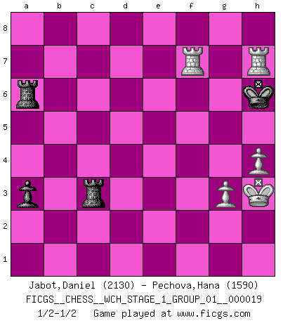 Last move : 1/2-1/2 2018 August 25 16:41:8 [Event "FICGS__CHESS__WCH_STAGE_1_GROUP_01__000019"] [Site "FICGS"] [Date "2018.03.02"] [Round "1"] [White "Jabot,Daniel"] [Black "Pechova,Hana"] [Result "1/2-1/2"] [WhiteElo "2130"] [BlackElo "1590"] 1.e4 c5 2.Nf3 Nc6 3.d4 cxd4 4.Nxd4 Nf6 5.Nc3 e5 6.Ndb5 d6 7.Bg5 a6 8.Na3 b5 9.Bxf6 gxf6 10.Nd5 f5 11.Bd3 Be6 12.O-O Bxd5 13.exd5 Ne7 14.Nxb5 Bg7 15.Nc3 e4 16.Be2 O-O 17.Rb1 Ng6 18.f3 Qb6+ 19.Kh1 Qe3 20.fxe4 fxe4 21.Bg4 Bxc3 22.bxc3 Qxc3 23.Rb3 Qe5 24.Rf5 Qe7 25.Re3 Rab8 26.h3 Rb2 27.Qe2 Rxa2 28.Rxe4 Qc7 29.Rf2 a5 30.Bf5 Qc5 31.Kh2 Qxd5 32.h4 Ra1 33.Rg4 Kh8 34.Bxg6 hxg6 35.Rxg6 Qe5+ 36.Qxe5+ dxe5 37.Rg5 Re1 38.Rf6 Kh7 39.Rg4 Re2 40.Kh3 Rxc2 41.Rf5 Kh6 42.Rxe5 Ra8 43.Rf5 Ra6 44.Rxf7 a4 45.R4g7 Rc3+ 46.g3 a3 47.Rh7+ Kg6 48.Rhg7+ Kh6 49.Rh7+ 1/2-1/2 Sicilian : Pelikan (Lasker/Sveshnikov) variation Kingside Castling by player White (move 12) Kingside Castling by player Black (move 16) 10 pieces endgame at move 42 : White KRRPP , Black KRRPP WHITE : King + 2 Rooks 2 Pawns BLACK : King + 2 Rooks 2 Pawns 9 pieces endgame at move 44 : White KRRPP , Black KRRP WHITE : King + 2 Rooks 2 Pawns BLACK : King + 2 Rooks 1 Pawn This chess game ended in a draw. Follow this game move after move (download)A chess genius has died; a loss for humanity. (Viktor Kortchnoi, about Bobby Fischer's death) Ich war zu klein für die Schach-Schülermannschaft! (Woody Allen) Cuando veas una buena jugada, trata de encontrar otra mejor. (Emanuel Lasker) La guerre est enfant de la passion, la passion est enfant du narcissisme et le narcissisme est l'enfant. (...) Une autre partie ? (Thibault de Vassal) Perception is reality. (Immanuel Kant)