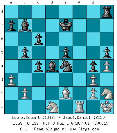Last move : 0-1 2018 April 23 21:58:59 [Event "FICGS__CHESS__WCH_STAGE_1_GROUP_01__000019"] [Site "FICGS"] [Date "2018.03.02"] [Round "1"] [White "Csoma,Robert"] [Black "Jabot,Daniel"] [Result "0-1"] [WhiteElo "1312"] [BlackElo "2130"] 1.Nf3 d5 2.d4 Nf6 3.c4 c6 4.Nc3 e6 5.Bg5 h6 6.Bh4 dxc4 7.e4 g5 8.Bg3 b5 9.a3 Bb7 10.Be2 Nbd7 11.O-O Nh5 12.d5 Nxg3 13.fxg3 Bg7 14.dxe6 fxe6 15.Qd6 Qe7 16.Qc7 Nc5 17.Qxe7+ Kxe7 18.Rad1 Rad8 19.h4 g4 20.Nh2 h5 21.Rf4 Rxd1+ 22.Nxd1 Bd4+ 23.Kh1 e5 24.Rf1 Nxe4 0-1 Reti Opening Kingside Castling by player White (move 11) Player Black won this chess game. Follow this game move after move (download)The tactician knows what to do when there is something to do; whereas the strategian knows what to do when there is nothing to do. (Gerald Abrahams) Es gibt keine einzige Frau, der ich nicht einen Springer vorgeben könnte und trotzdem gewänne. (Robert James Fischer) Me dio la sensación de como si yo estuviera jugando en contra del mismo Ajedrez. - al estar jugando en contra de Robert Fischer (Walter Shipman) Les Echecs ont trois composantes : le temps, l'espace et le matériel en dernier. (Mikhail Tal) Convictions are more dangerous enemies of truth than lies. (Friedrich Nietzsche)