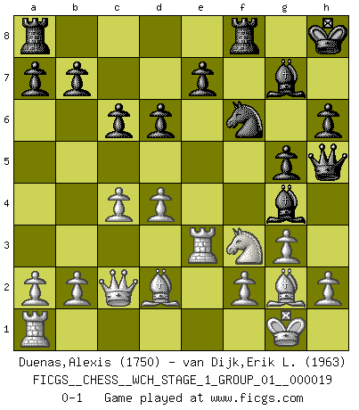 Last move : 0-1 2018 April 24 9:26:17 [Event "FICGS__CHESS__WCH_STAGE_1_GROUP_01__000019"] [Site "FICGS"] [Date "2018.03.02"] [Round "1"] [White "Duenas,Alexis"] [Black "van Dijk,Erik L."] [Result "0-1"] [WhiteElo "1750"] [BlackElo "1963"] 1.d4 f5 2.Nf3 Nf6 3.g3 g6 4.Bg2 Bg7 5.O-O O-O 6.c4 d6 7.Nc3 c6 8.Qb3 Kh8 9.Bg5 Nbd7 10.Qc2 Qe8 11.e4 h6 12.Bd2 fxe4 13.Nxe4 g5 14.Nxf6 Nxf6 15.Rfe1 Bg4 16.Re3 Qh5 0-1 Dutch Kingside Castling by player White (move 5) Kingside Castling by player Black (move 5) Player Black won this chess game. Follow this game move after move (download)Later, I began to succeed in decisive games. Perhaps because I realized a very simple truth: not only was I worried, but also my opponent. (Mikhail Tal) Glücklicherweise sind Großmeister Ruben Fines reine Schachbücher weniger phallozentrisch [als seine Schachpsychologie] und deswegen auch weniger lächerlich. (Nigel Short) Si yo gano un torneo, yo lo gano por mí mismo. Yo hago las jugadas. Nadie me ayuda. (Bobby Fischer) Karpov est une pièce de musée. (Garry Kasparov) A good book on your shelf is a friend that turns its back on you and remains a friend. (Author unknown)