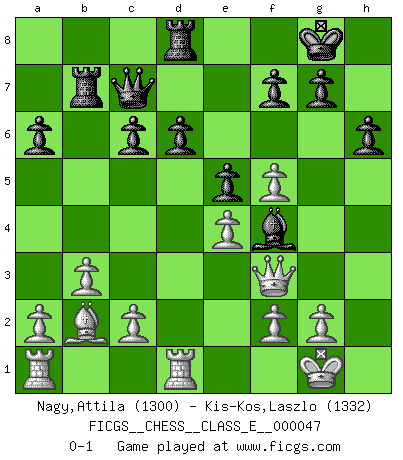 Last move : 0-1 2007 October 14 0:35:28 [Event "FICGS__CHESS__CLASS_E__000047"] [Site "FICGS"] [Date "2007.04.25"] [Round "1"] [White "Nagy,Attila"] [Black "Kis-Kos,Laszlo"] [Result "0-1"] [WhiteElo "1300"] [BlackElo "1332"] 1.e4 c5 2.Nf3 d6 3.d4 cxd4 4.Qxd4 Nc6 5.Bb5 a6 6.Bxc6+ bxc6 7.Nc3 e5 8.Qe3 Be7 9.h3 Nf6 10.O-O O-O 11.Rd1 Qc7 12.b3 h6 13.Bb2 Be6 14.Ne2 Rfb8 15.Ng3 Rb7 16.Nh4 Ng4 17.hxg4 Bxh4 18.Nf5 Bg5 19.Qg3 Bf4 20.Qf3 Bxf5 21.gxf5 Rd8 0-1 This chess game has been lost on time (started : 2007.04.25 14:49:23) Sicilian, Chekhover variation Kingside Castling by player White (move 10) Kingside Castling by player Black (move 10) Player Black won this chess game. Follow this game move after move (download)No price is too great for the scalp of the enemy King. (Koblentz) Zu meiner Zeit war ein 20 jähriger ein junger Spieler, heute ist er ein Veteran. (Garry Kasparov) El Ajedrez, como cualquier otra actividad creativa, puede existir solo a través de méritos combinados de aquellos que tienen talento creativo y de aquellos que tienen la habilidad de organizar un trabajo creativo. (Mikhail Botvinnik) On croit qu'il y a plus de mauvais joueurs que de bons joueurs, c'est faux : Il y a autant de joueurs qui gagnent que de joueurs qui perdent. (Philippe Geluck) Pretend inferiority and encourage his arrogance. (Sun Tzu)