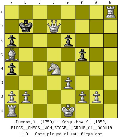 Last move : 1-0 2018 April 9 17:38:0 [Event "FICGS__CHESS__WCH_STAGE_1_GROUP_01__000019"] [Site "FICGS"] [Date "2018.03.02"] [Round "1"] [White "Duenas,Alexis"] [Black "Konyukhov,Konstantin"] [Result "1-0"] [WhiteElo "1750"] [BlackElo "1352"] 1.d4 d5 2.c4 dxc4 3.e3 f6 4.Bxc4 a6 5.Qb3 c6 6.Bxg8 Rxg8 7.Qxg8 Qa5+ 8.Nc3 e6 9.Qxh7 c5 10.Qg6+ Ke7 11.Nge2 Kd7 12.Qf7+ Kc6 13.Qxf8 Nd7 14.Qxg7 f5 15.h4 cxd4 16.Nxd4+ Kd6 17.h5 Ne5 18.Qf8+ Kc7 19.h6 Rb8 20.h7 Ng6 21.Qg7+ Ne7 22.Qxe7+ Bd7 23.h8Q Rxh8 24.Rxh8 Qa4 25.Nxa4 b5 26.Bd2 bxa4 27.Ba5+ Kb7 28.Qxd7+ 1-0 Queen's gambit accepted Promotion Queen by player White (move 23) Player White won this chess game. Follow this game move after move (download)Chess is a sea in which a gnat may drink and an elephant may bathe. (Hindu proverb) Das Spiel gibt uns die Genugtuung, die das Leben uns versagt. (Emanuel Lasker) Ciertamente, de todas la drogas del mundo, el Ajedrez debe ser el mas placentero permamentemente. (Assiac) Je ne crois pas en la psychologie, je crois aux bons coups. (Robert Fischer) In every real man a child is hidden that wants to play. (Friedrich Nietzsche)