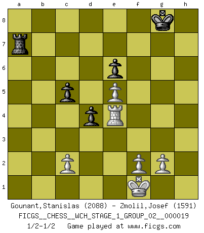 Last move : 1/2-1/2 2018 June 6 6:24:58 [Event "FICGS__CHESS__WCH_STAGE_1_GROUP_02__000019"] [Site "FICGS"] [Date "2018.03.02"] [Round "1"] [White "Gounant,Stanislas"] [Black "Zmolil,Josef"] [Result "1/2-1/2"] [WhiteElo "2088"] [BlackElo "1591"] 1.d4 d5 2.Nf3 Nf6 3.e3 e6 4.Bd3 c5 5.b3 Nc6 6.O-O cxd4 7.exd4 Be7 8.Bb2 O-O 9.Nbd2 b6 10.a3 Bb7 11.Ne5 Nxe5 12.dxe5 Nd7 13.b4 a5 14.Qg4 Qc7 15.Nf3 axb4 16.axb4 h6 17.Rae1 Ra4 18.Bc1 Rxb4 19.Qg3 h5 20.Qh3 Nc5 21.Ba3 Re4 22.Bxc5 bxc5 23.Qxh5 g6 24.Qh6 Rxe1 25.Rxe1 d4 26.h4 Rb8 27.Ng5 Bxg5 28.Qxg5 Bd5 29.h5 Qd8 30.Qxd8+ Rxd8 31.hxg6 fxg6 32.Bxg6 Rd7 33.Bd3 Rg7 34.Be4 Bxe4 35.Rxe4 Ra7 36.Kf1 1/2-1/2 Queen's pawn game, Rubinstein (Colle-Zukertort) variation Kingside Castling by player White (move 6) Kingside Castling by player Black (move 8) This chess game ended in a draw. Follow this game move after move (download)After a bad opening, there is hope for the middle game. After a bad middle game, there is hope for the endgame. But once you are in the endgame, the moment of truth has arrived. (Edmar Mednis) Schach wird sich dank seiner hohen kulturellen Tradition immer durchsetzen. In näherer Zukunft womöglich sogar als Gegenreaktion auf die maßlose Reizüberflutung im Freizeit- und Spielbereich. (Garry Kasparov) Muchos se han convertido en Maestros de Ajedrez, nadie se ha convertido en el Maestro del Ajedrez. (Siegbert Tarrasch) On peut tirer plus d'utilité d'une partie perdue que de 100 parties gagnées. (Capablanca) Man is still the most extraordinary computer of all. (John F. Kennedy)
