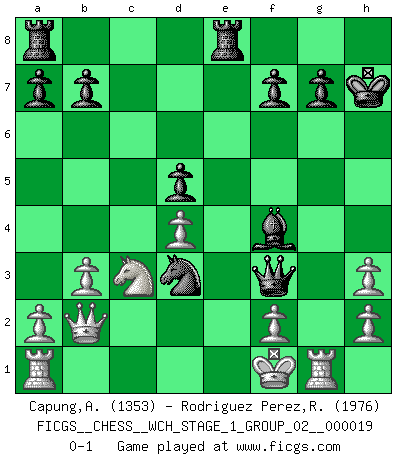 Last move : 0-1 2018 May 19 23:36:18 [Event "FICGS__CHESS__WCH_STAGE_1_GROUP_02__000019"] [Site "FICGS"] [Date "2018.03.02"] [Round "1"] [White "Capung,Albab"] [Black "Rodriguez Perez,Rene"] [Result "0-1"] [WhiteElo "1353"] [BlackElo "1976"] 1.e3 d5 2.c4 e6 3.cxd5 exd5 4.Nf3 Nf6 5.Qa4+ c6 6.Bd3 Bd6 7.Qc2 O-O 8.b3 c5 9.Bb2 Nc6 10.Bxf6 Qxf6 11.Bxh7+ Kh8 12.d4 cxd4 13.exd4 Re8+ 14.Kf1 Qxf3 15.Nc3 Bh3 16.Rg1 Nb4 17.Qd2 Kxh7 18.gxh3 Bf4 19.Qb2 Nd3 0-1 This chess game has been lost on time (started : 2018.03.02 0:49:18) Van't Kruijs Opening Kingside Castling by player Black (move 7) Player Black won this chess game. Follow this game move after move (download)Becoming successful at Chess allows you to discover your own personality. That's what I want for the kids I teach. (Saudin Robovic) Die unerbitterlichsten Regeln im Schach sind die Ausnahmen. (Savielly Grigorievitsch Tartakower) Si tu oponente no puede hacer nada activo, entonces no apures la posición; En vez de eso, dejalo estar sentado ahí, sufriendo y rogandote por un empate. (Jeremy Silman) Botvinnik disait en comparant les échecs à la musique: Il existe une science dont le but est l'étude de l'acoustique et des sons. Mais il y a aussi un art qui se sert de l'océan des sons : c'est la musique. De toute évidence, il en est de même pour la pensée. La logique est l'étude des lois de la réflexion et les échecs reflètent, en tant qu'art, le côté logique de la réflexion, sous la forme d'images artistiques... Extrait de Fischer - Spassky, Reykjavik 1972 par Alexander & F. Wyndham (Ed. Solar), p 37. Some people are so afraid to die that they never begin to live. (Henry Van Dyke)