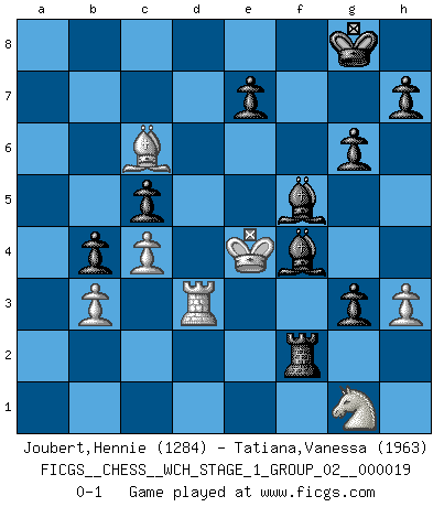 Last move : 0-1 2018 March 26 14:21:38 [Event "FICGS__CHESS__WCH_STAGE_1_GROUP_02__000019"] [Site "FICGS"] [Date "2018.03.02"] [Round "1"] [White "Joubert,Hennie"] [Black "Tatiana,Vanessa"] [Result "0-1"] [WhiteElo "1284"] [BlackElo "1963"] 1.e4 c5 2.Nf3 d6 3.d4 cxd4 4.Nxd4 Nf6 5.Nc3 g6 6.f4 Nc6 7.Nxc6 bxc6 8.Be2 Bg7 9.O-O O-O 10.Be3 Qc7 11.Qd2 Rd8 12.Rad1 Rb8 13.b3 Ng4 14.h3 Nxe3 15.Qxe3 Qb6 16.Qxb6 axb6 17.Nb1 b5 18.c4 b4 19.Rd2 c5 20.Rc2 Ra8 21.Nd2 Rd7 22.Bf3 Bd4+ 23.Kh2 Rda7 24.e5 Rxa2 25.Rxa2 Rxa2 26.Rd1 dxe5 27.fxe5 Bxe5+ 28.Kh1 f5 29.Bc6 Rb2 30.Nf3 Bd6 31.Rd3 Rb1+ 32.Ng1 f4 33.g4 fxg3 34.Kg2 Rb2+ 35.Kf3 Rf2+ 36.Ke3 Bf4+ 37.Ke4 Bf5+ 0-1 Sicilian : Dragon, Levenfish variation Kingside Castling by player White (move 9) Kingside Castling by player Black (move 9) Player Black won this chess game. Follow this game move after move (download)You are for me the Queen on d8 and I am the Pawn on d7 !! (Eduard Gufeld) Ein Großmeister muß tausende Partien in seinem Kopf speichern, denn diese sind für Ihn, was die Worte der Muttersprache für gewöhnliche Leute sind, oder Noten für Musiker... (Garry Kasparov) Las combinaciones han sido siempre el aspecto más intrigante del Ajedrez. Los Maestros las buscan, el público las aplauden, los críticos las alaban. La razón se debe a que las combinaciones hacen posible que el Ajedrez sea más que un ejercicio matemático con una carencia de vida. Ellas son la poesía del juego, son del Ajedrez lo que la melodía es de la música. Ellas representan el triunfo de la mente sobre la materia. (Reuben Fine) Fischer est le meilleur joueur du monde et Karpov n'est qu'un joueur de bistrot. (Garry Kasparov, agé de 16 ans) Looking at the proliferation of personal web pages on the Net, it looks like very soon everyone on Earth will have 15 megabytes of fame. (M.G. Sriram)