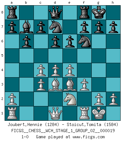 Last move : 1-0 2018 April 22 9:35:59 [Event "FICGS__CHESS__WCH_STAGE_1_GROUP_02__000019"] [Site "FICGS"] [Date "2018.03.02"] [Round "1"] [White "Joubert,Hennie"] [Black "Stoicut,Tomita"] [Result "1-0"] [WhiteElo "1284"] [BlackElo "1584"] 1.e4 b6 2.d4 Bb7 3.f3 e6 4.Be3 Nf6 5.c4 Bb4+ 6.Nc3 Bxc3+ 7.bxc3 d6 8.Bd3 Nbd7 9.Ne2 O-O 10.O-O 1-0 This chess game has been lost on time (started : 2018.03.02 0:49:18) Owen defense Kingside Castling by player Black (move 9) Kingside Castling by player White (move 10) Player White won this chess game. Follow this game move after move (download)Every Pawn is a potential Queen. (James Mason) Bogoljubow: Matt in vier Zügen! Tartakower: Ich verbitte mir jede Belästigung! (Savielly Grigorievitsch Tartakower) La caracteristica mas importante en la posición del Ajedrez es la actividad de las piezas. Esto es absolutamente fundamental en todas las fases del juego: Apertura, Juego Medio y especialmente Finales. La limitación primordial en la actividad de una pieza, es la estructuración de los Peones. (Michael Stean) La vérité est comme le meilleur coup aux échecs : elle existe, mais il faut la chercher. (Arturo Perez-Reverte) Life is pain my dear and anyone who says otherwise is selling something. (Princess Bride)