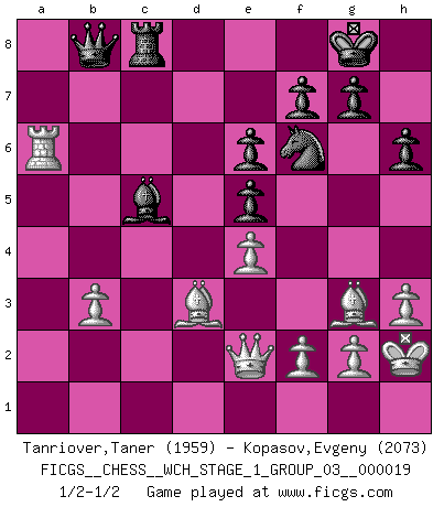 Last move : 1/2-1/2 2018 June 18 22:43:11 [Event "FICGS__CHESS__WCH_STAGE_1_GROUP_03__000019"] [Site "FICGS"] [Date "2018.03.02"] [Round "1"] [White "Tanriover,Taner"] [Black "Kopasov,Evgeny"] [Result "1/2-1/2"] [WhiteElo "1959"] [BlackElo "2073"] 1.e4 c5 2.d4 cxd4 3.Nf3 Nc6 4.c3 dxc3 5.Nxc3 e6 6.Be2 a6 7.O-O Qc7 8.Be3 Nf6 9.Rc1 Bd6 10.h3 O-O 11.Qd2 Qb8 12.Rfd1 Bc7 13.Bd3 b5 14.a4 Bb7 15.axb5 axb5 16.Nxb5 Ba5 17.Nc3 Bb4 18.Bf4 d6 19.Qe2 Ne5 20.Nxe5 dxe5 21.Bg3 Rc8 22.Nb5 Rxc1 23.Rxc1 h6 24.Kh2 Ra5 25.Nd4 Bd6 26.Nc6 Bxc6 27.Rxc6 Rc5 28.Ra6 Rc8 29.b3 Bc5 1/2-1/2 Sicilian : Smith-Morra gambit Kingside Castling by player White (move 7) Kingside Castling by player Black (move 10) This chess game ended in a draw. Follow this game move after move (download)Bobby just drops the pieces and they fall on the right squares. (Miguel Najdorf) Ivan Sokolov treibt mich als Beifahrer an mit go Loeky go - . (Loek van Wely) Los problemas de Ajedrez exigen del compositor las mismas virtudes que caracterizan todo el arte de valor: originalidad, invención, concisión, armonía, complejidad e insinceridad explendida. (Vladimir Nabokov) Les Echecs mettent en conflit, non pas deux intelligences, mais deux volontés. (Lasker) Live, lose, and learn, by observing your opponent how to win. (Amber Steenbock)