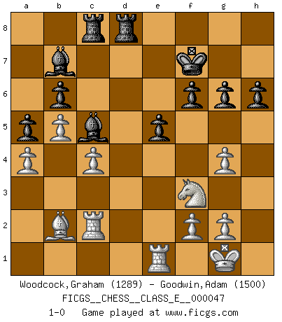 Last move : 1-0 2007 September 17 14:48:52 [Event "FICGS__CHESS__CLASS_E__000047"] [Site "FICGS"] [Date "2007.04.25"] [Round "1"] [White "Woodcock,Graham"] [Black "Goodwin,Adam"] [Result "1-0"] [WhiteElo "1289"] [BlackElo "1500"] 1.d4 Nf6 2.c4 e6 3.a3 c5 4.dxc5 Bxc5 5.Nc3 h6 6.e4 Nc6 7.Bd3 Ne5 8.Nf3 Nxd3+ 9.Qxd3 d6 10.h3 a6 11.e5 dxe5 12.Qxd8+ Kxd8 13.Nxe5 Ke7 14.O-O Rd8 15.Ng4 Nxg4 16.hxg4 b6 17.Ne2 Bb7 18.b4 Bd6 19.Bb2 Rac8 20.Rac1 f6 21.Rfe1 e5 22.Nd4 g6 23.Rc2 Kf7 24.Nf3 a5 25.b5 Bc5 26.a4 1-0 Queen's pawn game Kingside Castling by player White (move 14) Player White won this chess game. Follow this game move after move (download)There just isn't enough televised Chess. (David Letterman) Eine Person mit durchschnittlichem IQ kann etwa eine ELO von 2000 erreichen. (Jonathan Levitt) Todo lo que importa ante el tablero de Ajedrez son buenas jugadas. (Bobby Fischer) Il n'y a pas eu de défaite parce que je ne crois pas que cet ordinateur ait jamais existé. IBM a triché en refusant d'imprimer les modes de recherche de la machine. C'est évident, pendant le match, des coups décisifs ont été joués par des êtres humains. Aujourd'hui, les meilleurs spécialistes en informatique ne peuvent toujours pas expliquer comment Deep-Blue a pu jouer contre la logique des ordinateurs. IBM a gagné une guerre de communication, mais ils sont incapables de prouver que l'ordinateur a gagné tout seul. (Garry Kasparov) Rules and bones are meant to be broken. (Anonymous)