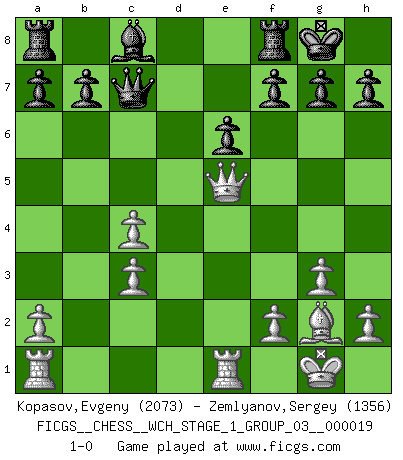 Last move : 1-0 2018 May 1 22:17:18 [Event "FICGS__CHESS__WCH_STAGE_1_GROUP_03__000019"] [Site "FICGS"] [Date "2018.03.02"] [Round "1"] [White "Kopasov,Evgeny"] [Black "Zemlyanov,Sergey"] [Result "1-0"] [WhiteElo "2073"] [BlackElo "1356"] 1.d4 Nf6 2.c4 e6 3.Nc3 Bb4 4.Qc2 O-O 5.Nf3 c5 6.dxc5 Na6 7.g3 Nxc5 8.Bg2 Nce4 9.O-O Nxc3 10.bxc3 Be7 11.e4 d6 12.e5 dxe5 13.Nxe5 Qc7 14.Qe2 Bd6 15.Re1 Nd7 16.Bf4 Bxe5 17.Bxe5 Nxe5 18.Qxe5 1-0 This chess game has been lost on time (started : 2018.03.02 0:49:21) Nimzo-Indian : Classical variation Kingside Castling by player Black (move 4) Kingside Castling by player White (move 9) Player White won this chess game. Follow this game move after move (download)Let the perfectionist play postal. (Yasser Seirawan) Es gibt zwei Arten von Opfern: Korrekte und meine. (Mikhail Nekhemyevich Tal) El jugador táctico debe saber que hacer cuando algo se debe de hacer. El estratégico debe saber que hacer cuando nada se debe de hacer. (Savielly Tartakover) On est toujours la mazette de quelqu'un d'autre. (Anonyme) Wipe them out. All of them. (Darth Sidious in Star Wars ep.1)