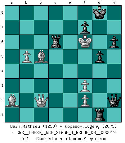 Last move : 0-1 2018 June 7 13:25:13 [Event "FICGS__CHESS__WCH_STAGE_1_GROUP_03__000019"] [Site "FICGS"] [Date "2018.03.02"] [Round "1"] [White "Bain,Mathieu"] [Black "Kopasov,Evgeny"] [Result "0-1"] [WhiteElo "1259"] [BlackElo "2073"] 1.d4 d5 2.c4 dxc4 3.e3 Nf6 4.Nc3 e6 5.a3 a6 6.Bxc4 b5 7.Ba2 Bb7 8.Nf3 c5 9.O-O Nbd7 10.d5 exd5 11.Nxd5 c4 12.Nxf6+ Qxf6 13.Re1 Rd8 14.e4 Nc5 15.Qc2 h6 16.e5 Qe6 17.Be3 Bxf3 18.gxf3 Nd3 19.Red1 Qxe5 20.Rxd3 Rxd3 21.Re1 Be7 22.a4 O-O 23.axb5 axb5 24.b3 Rfd8 25.bxc4 Bc5 26.Bxc5 Qxe1+ 27.Kg2 Rd1 28.cxb5 Qh1+ 29.Kg3 Rg1+ 30.Kf4 g5+ 31.Ke5 Qxh2+ 32.Kf6 Rd6+ 0-1 This chess game has been lost on time (started : 2018.03.02 0:49:21) Queen's gambit accepted Kingside Castling by player White (move 9) Kingside Castling by player Black (move 22) Player Black won this chess game. Follow this game move after move (download)Many Chess players were surprised when after the game, Fischer quietly explained: 'I had already analyzed this possibility' in a position which I thought was not possible to foresee from the opening. (Mikhail Tal) Die unerbitterlichsten Regeln im Schach sind die Ausnahmen. (Savielly Grigorievitsch Tartakower) Si tu oponente no puede hacer nada activo, entonces no apures la posición; En vez de eso, dejalo estar sentado ahí, sufriendo y rogandote por un empate. (Jeremy Silman) Tout change constamment, y compris dans le monde des Echecs. (Botvinnik) There is no instance of a country having benefited from prolonged warfare. (Sun Tzu)