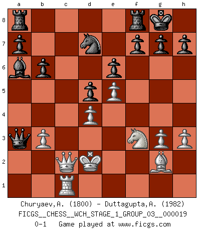 Last move : 0-1 2018 April 10 14:22:18 [Event "FICGS__CHESS__WCH_STAGE_1_GROUP_03__000019"] [Site "FICGS"] [Date "2018.03.02"] [Round "1"] [White "Churyaev,Alexey"] [Black "Duttagupta,Aniruddha"] [Result "0-1"] [WhiteElo "1800"] [BlackElo "1982"] 1.e4 c5 2.Nf3 d6 3.g3 Nf6 4.d3 b6 5.Bg2 Bb7 6.Qe2 e6 7.c3 Nc6 8.h3 Qc7 9.b3 Be7 10.Bb2 d5 11.e5 Nd7 12.d4 cxd4 13.cxd4 Nb4 14.Nc3 Ba6 15.Qd2 Nd3+ 16.Kd1 Bb4 17.a3 Bxc3 18.Bxc3 Nxf2+ 19.Qxf2 Qxc3 20.Qc2 Qxa1+ 21.Kd2 Qxa3 22.Rc1 O-O 0-1 Sicilian Kingside Castling by player Black (move 22) Player Black won this chess game. Follow this game move after move (download)It's just you and your opponent at the board and you're trying to prove something. (Bobby Fischer) Korrekt heißt in Deutschland die Haltung eines Mannes, dessen Benehmen nach dem Urteile seiner Nachbarn seiner Stellung angemessen ist. Um korrekt zu sein, muß man sich der Meinung der anderen anpassen... (Emanuel Lasker) Cuando no sepas que mover, espera por una idea que se le venga a la la cabeza de tu oponente. Tenlo por seguro de que esa idea estará incorrecta. (Siegbert Tarrasch) Le moment que je préfère le plus dans une rencontre, c'est celui où je sens que la personnalité de l'adversaire se brise. (Robert Fischer) In fact if nothing is done against this teddy bear, hereby I announce that I would quit chess, rapid chess, blitz chess, postal chess, email chess, server chess and correspondence chess I will then switch to a table game where teddy bears aren't going to be seen for a while, like Poker, or Roulette, all 18+ games. (Elmer Valderrama)