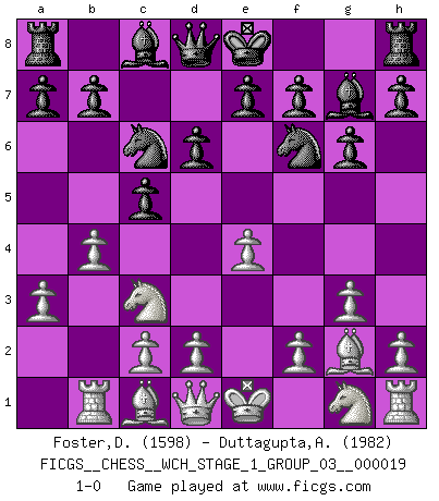 Last move : 1-0 2018 April 7 20:4:19 [Event "FICGS__CHESS__WCH_STAGE_1_GROUP_03__000019"] [Site "FICGS"] [Date "2018.03.02"] [Round "1"] [White "Foster,Duncan"] [Black "Duttagupta,Aniruddha"] [Result "1-0"] [WhiteElo "1598"] [BlackElo "1982"] 1.e4 c5 2.a3 g6 3.b4 Bg7 4.Nc3 d6 5.g3 Nc6 6.Rb1 Nf6 7.Bg2 Ng1 8.Nge2 Rb8 9.bxc5 dxc5 10.O-O b6 11.f4 1-0 Sicilian defense Follow this game move after move (download)Best by test: 1. e4 (Bobby Fischer) Was ist der Unterschied zwischen einem Strassenarbeiter und einem Schachspieler? --Der Schachspieler bewegt sich ab und zu. (Anonymous) La belleza de un movimiento no se refleja solo en su apariencia, sino en el pensamiento detrás de él. (Siegbert Tarrasch) Les Echecs sont et restent toujours un combat, un combat intégral comme la boxe, la lutte ou un autre sport, et où il doit y avoir un vainqueur et un vaincu. (Joseph Emil Diemer) History is the quarrels of popes and kings, with wars or pestilences in every page; the men all so good for nothing, and hardly any women at all. (Jane Austen)
