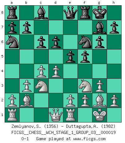 Last move : 0-1 2018 May 2 22:33:25 [Event "FICGS__CHESS__WCH_STAGE_1_GROUP_03__000019"] [Site "FICGS"] [Date "2018.03.02"] [Round "1"] [White "Zemlyanov,Sergey"] [Black "Duttagupta,Aniruddha"] [Result "0-1"] [WhiteElo "1356"] [BlackElo "1982"] 1.d4 f5 2.g3 Nf6 3.Bg2 g6 4.Nf3 Bg7 5.O-O O-O 6.c4 d6 7.Nc3 c6 8.b3 Na6 9.Bb2 Qe8 10.Re1 e5 0-1 This chess game has been lost on time (started : 2018.03.02 0:49:21) Dutch defense Kingside Castling by player White (move 5) Kingside Castling by player Black (move 5) Player Black won this chess game. Follow this game move after move (download)The Pin is mightier than the sword. (Fred Reinfeld) Wer nie einen Fehler gemacht hat, hat nie etwas Neues ausprobiert. (Albert Einstein) El Ajedrez, como cualquier otra actividad creativa, puede existir solo a través de méritos combinados de aquellos que tienen talento creativo y de aquellos que tienen la habilidad de organizar un trabajo creativo. (Mikhail Botvinnik) Il n'y a pas de prix trop élevé au scalp de l'ennemi. (Koblentz) He is a liar. I just don't know what the lie is yet. (Horatio Caine, C.S.I. Miami)