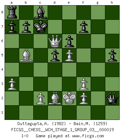 Last move : 1-0 2018 April 4 17:8:50 [Event "FICGS__CHESS__WCH_STAGE_1_GROUP_03__000019"] [Site "FICGS"] [Date "2018.03.02"] [Round "1"] [White "Duttagupta,Aniruddha"] [Black "Bain,Mathieu"] [Result "1-0"] [WhiteElo "1982"] [BlackElo "1259"] 1.e4 e6 2.d4 d5 3.Nc3 Bb4 4.e5 c5 5.a3 Bxc3+ 6.bxc3 cxd4 7.cxd4 Nc6 8.Qg4 g6 9.Nf3 h5 10.Qf4 Qa5+ 11.Bd2 Qb6 12.Bd3 g5 13.Qxg5 Nxd4 14.Qg7 Nxf3+ 15.gxf3 Qb2 16.Qxh8 Qxa1+ 17.Ke2 Qxh1 18.Qxg8+ Kd7 19.Qf8 Qxh2 20.Bb5+ Kc7 21.Qd6+ 1-0 French : Winawer, Advance variation Player White won this chess game. Follow this game move after move (download)It is no time to be playing Chess when the house is on fire. (Italian Proverb) Ich hatte Zahnschmerzen im ersten Spiel. In der zweiten Partie tat mir der Kopf weh. In der dritten war es eine Rheuma-Attacke und während der vierten fühlte ich mich nicht gut. Und in der fünften? Nun, man muss doch nicht jedes Spiel gewinnen, oder? (Savielly Grigorievitsch Tartakower) El Ajedrez es un cuento de Hadas de las 1001 metidas de pata. (Savielly Tartakower) Le génie consiste à savoir transgresser les règles au moment opportun. (Teichmann) There is no vagueness without wind. (Chinese proverb)