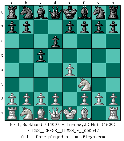 Last move : 0-1 2007 June 26 2:54:14 [Event "FICGS__CHESS__CLASS_E__000047"] [Site "FICGS"] [Date "2007.04.25"] [Round "1"] [White "Heil,Burkhard"] [Black "Lorena,JC Mei"] [Result "0-1"] [WhiteElo "1400"] [BlackElo "1600"] 1.e4 c5 2.Nf3 d6 0-1 This chess game has been lost on time (started : 2007.04.25 14:49:23) Sicilian Player Black won this chess game. Follow this game move after move (download)Chess is a beautiful mistress. (Bent Larsen) Man gibt nur Pakete auf. (Paul Keres) Nunca nadie ha ganado una partida de Ajedrez rindiendose. (Unknown) Si je n'étais pas joueur d'échecs, je serais le meilleur dans quelque chose d'autre. (Anatoli Karpov) When I took office, only high energy physicists had ever heard of what is called the World Wide Web... Now even my cat has its own page. (Bill Clinton, 1996)