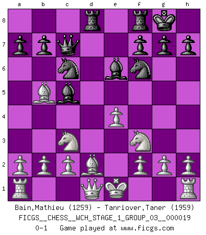 Last move : 0-1 2018 May 14 11:18:15 [Event "FICGS__CHESS__WCH_STAGE_1_GROUP_03__000019"] [Site "FICGS"] [Date "2018.03.02"] [Round "1"] [White "Bain,Mathieu"] [Black "Tanriover,Taner"] [Result "0-1"] [WhiteElo "1259"] [BlackElo "1959"] 1.d4 e5 2.dxe5 d6 3.exd6 Nf6 4.dxc7 Qxc7 5.Nc3 Nc6 6.e4 Bg4 7.Be2 Rd8 8.Bd2 Be6 9.Bb5 Bc5 10.Nf3 O-O 0-1 This chess game has been lost on time (started : 2018.03.02 0:49:21) Queen's pawn : Charlick (Englund) gambit Kingside Castling by player Black (move 10) Player Black won this chess game. Follow this game move after move (download)All I want to do, ever, is just play Chess. (Bobby Fischer) Es ist wirklich schade, dass so viele Schachspieler nicht auf ihr Äußeres achten! (Alexandra Kosteniuk) El sobresalir en el Ajedrez es un signo de una mente intrigante. (Sir Arthur Conan Doyle) A ce moment-là, je menaçais de comprendre la position ! (Clément L'Heureux) It's only after you lost everything, Tyler says, that you're free to do anything. (Chuck Palahniuk, Fight Club)
